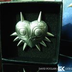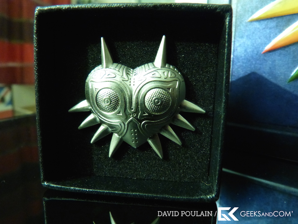 - Un badge couleur argent représentant également le masque de Majora. De petite taille, cette représentation du masque finement réalisée n’en reste pas moins de toute beauté.