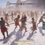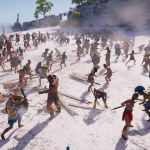 Une fois que cela est fait, on peut accéder à la guerre entre les spartiates et les Athéniens, qui consiste en un grand combat à 100 contre 100. On peut décider d’éliminer chaque ennemi un après l’autre, mais pour gagner le combat, on doit simplement affaiblir l’armée ennemie en tuant tour à tour les capitaines, le chef et le héros. Ce combat m’a particulièrement plu et ferait sans aucun doute un excellent mode multijoueur.