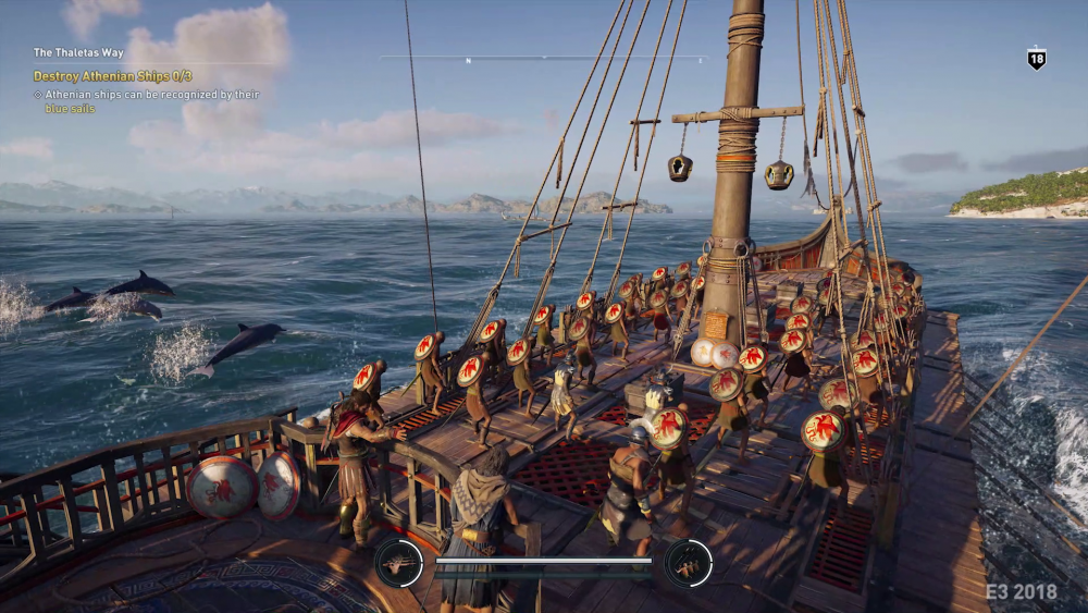 Je me suis même surpris à passer plusieurs minutes à nager dans la mer, ce que j’aimais beaucoup moins dans Origins. L’eau est tellement claire qu’on peut facilement en voir le fond et les nombreuses espèces de poissons, de requins ou de dauphins qui s’y promènent. Et ils ne sont pas là que pour des raisons esthétiques. Les dauphins nous suivent lors de nos balades en bateau, alors que les requins peuvent attaquer les ennemis lorsqu’on les pousse à l’eau.