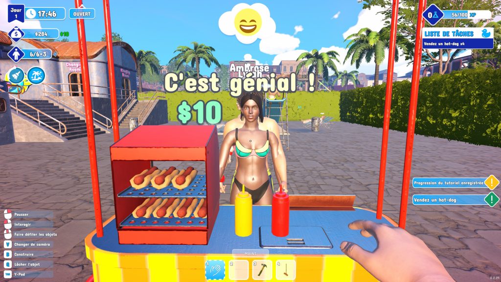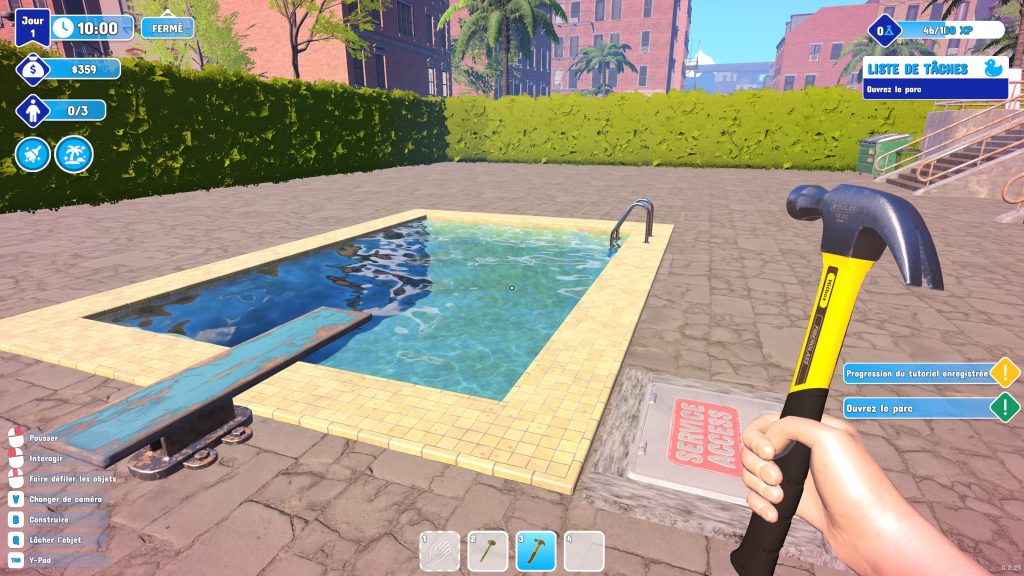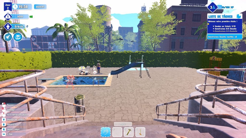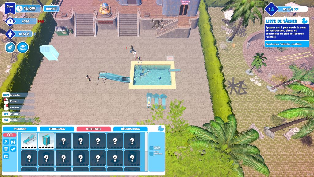 Une journée de Waterpark Simulator se déroule principalement toujours de la même façon. On doit s’occuper de l’entrée pour vendre les accès aux visiteurs. Par la suite, il faut surveiller notre parc, le nettoyer, le réparer, etc. Chaque action, chaque journée et chaque intervention rapportent de l’expérience et des points de recherche. Ces points permettent de débloquer progressivement de nouvelles attractions, des décorations supplémentaires ou des améliorations pour le personnel. Celui-ci est d’ailleurs pas tout de suite accessible. Il va falloir gérer ses priorités en début de partie. Heureusement, la progression est encadrée. Ça évite de tout avoir dès le départ et donne un sentiment d’évolution tangible.