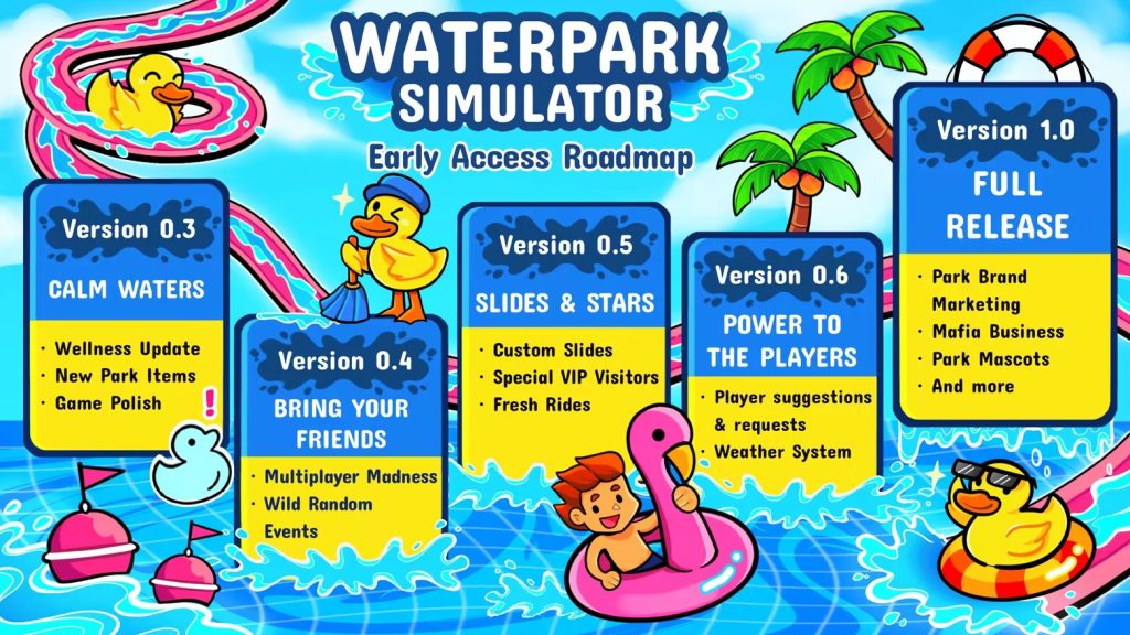 Le studio CayPlay ne cache pas son ambition pour Waterpark Simulator et a déjà dévoilé sa feuille de route jusqu’à la sortie finale. Si pour le moment, le contenu est faible, le futur semble prometteur. Les développeurs ont déjà mentionné vouloir ajouter davantage de contenu, enrichir les outils de personnalisation, corriger les failles de l’IA et offrir plus de variété dans les attractions. Le mode sandbox fait partie des demandes prioritaires de la communauté. En espérant que les développeurs soient à l’écoute.