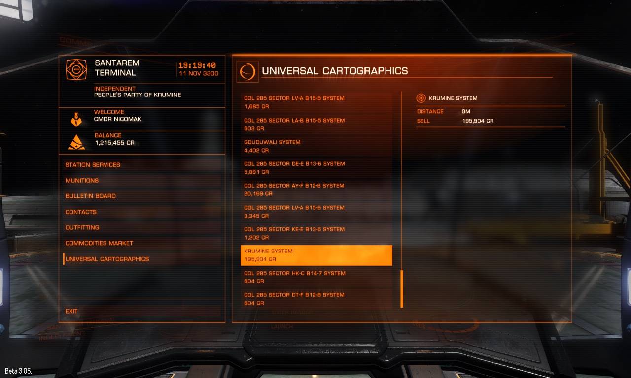 Chaque station dispose également d’un marché où vous pouvez (depuis votre vaisseau, via un simple écran) acheter ou vendre votre cargaison pour faire un petit bénéfice au passage. L’économie du jeu semble évoluer en temps réel et les besoins en ressources diffèrent suivant le système dans lequel vous vous trouver. Acheter du minerai dans une colonie minière pour le vendre dans un système plus agricole et éloigné peut s’avérer très lucratif par exemple.