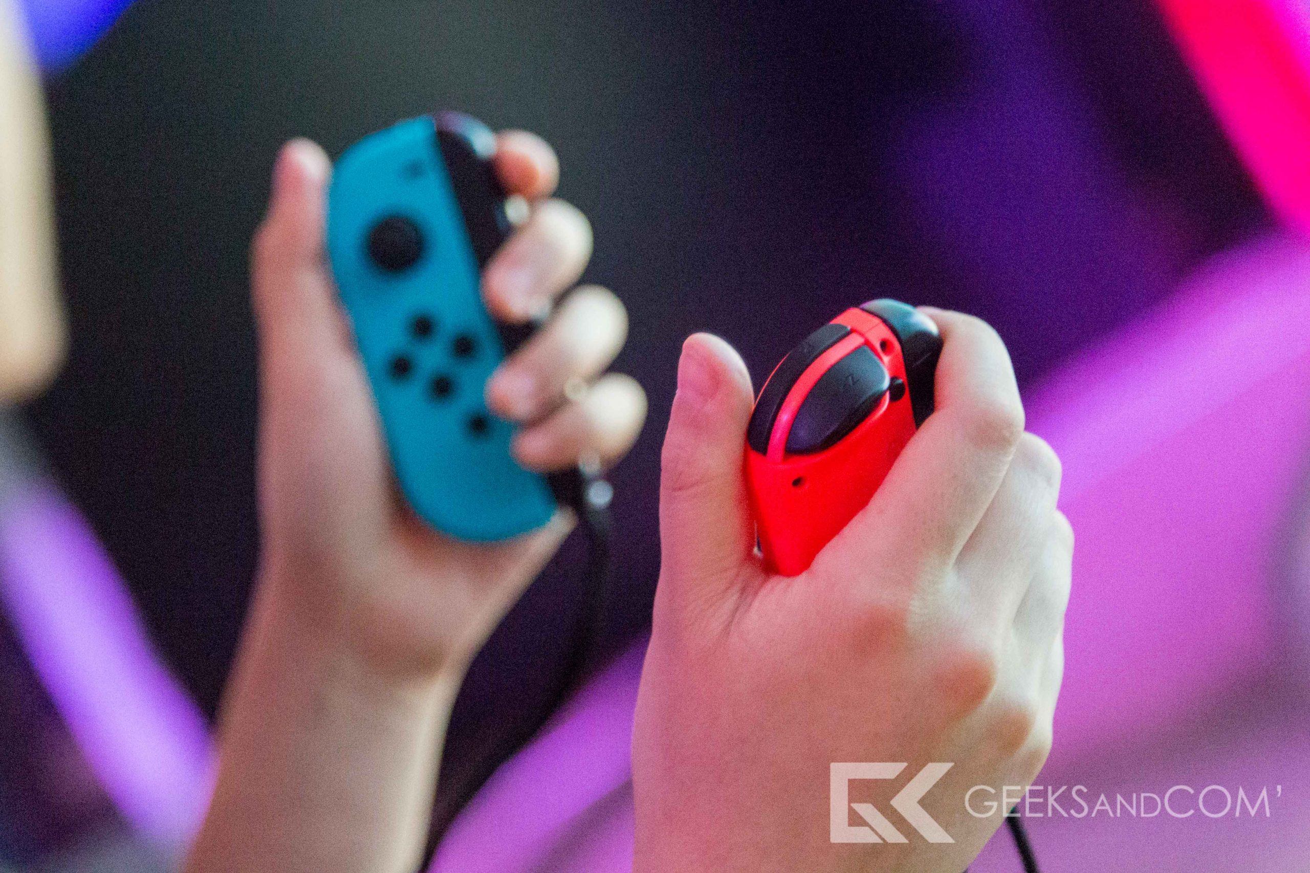 Lorsque l’on passait en mode vertical pour certains jeux, dont 1-2 Switch et Arms, c’était plutôt la proximité des boutons un peu trop rapprochés sur le dessus de la manette qui dérangeait. Les boutons L et R sont particulièrement étroits et il peut être compliqué de ne pas les mélanger avec les boutons ZL et ZR. Par contre, aucun doute que l’immersion y était et on reviendra davantage sur cet aspect avec notre résumé sur les jeux.