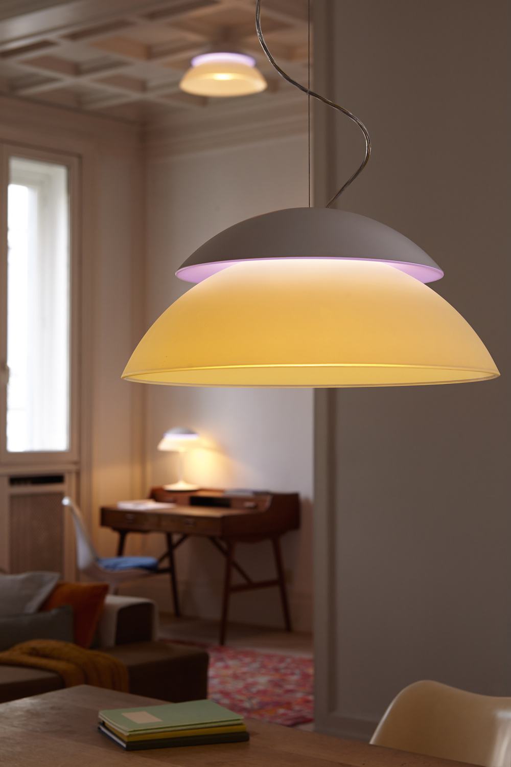 Reprenant toutes les trois le même principe de design avec deux dômes l’un sur l’autre, les trois modèles sont un plafonnier, une lampe suspendue ou encore une lampe de bureau. Ils consistent en une lampe blanche, dont on peut régler la puissance, ainsi qu’une partie colorée, caractéristique des produits Hue de Philips. Les deux parties lumineuses sont distinctes et peuvent être contrôlées séparément à partir de l’application habituelle. Évidemment on retrouvera toutes les fonctionnalités de programmation des lampes Philips Hue avec IFTTT, notamment pour programmer des alertes visuelles pour ses courriels ou les buts de son équipe favorite.