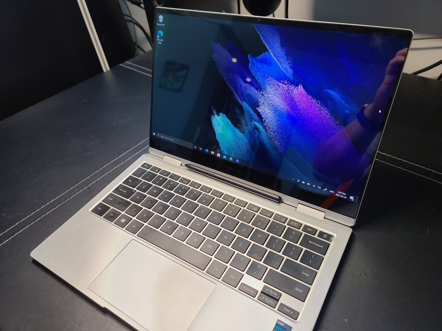 Puis, comme un grand enfant qui vient d’obtenir son nouveau joujou, je regarde avec quelle facilité je peux vraiment plier cet ordinateur. On dit que le Galaxy Book Pro 360 est versatile et, après tout, il y a 360 dans son nom. La réponse est oui sans problème et sans aucune résistance. J’ai vite sortie le S Pen (un peu large à mon goût) qui est inclus pour écrire comme si je prennais des notes dans un calpin.