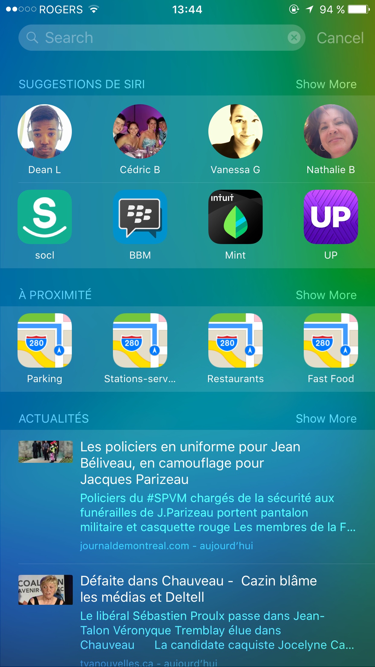 Il y a aussi la nouvelle recherche intelligente, propulsée par Siri. Lorsqu’on se trouve sur la première page de notre springboard, il est maintenant possible d’aller une page de plus vers la gauche, pour obtenir une nouvelle page de recherche. Se trouvent à cet endroit nos contacts favoris, ou ceux que nous sommes susceptibles de vouloir contacter, car ils sont présents dans un événement dans le calendrier. On y retrouve également les applications les plus utilisées, des suggestions d’endroits à proximité (bars, restaurants, cinémas, etc) ainsi qu’un résumé d’articles d’actualité. Dans mon utlisitation actuelle, le tout semble bien fonctionner sauf pour la section des applications suggérées qui n’est dans mon cas vraiment pas pertinente pour le moment et me propose des applications qui ne m’intéressent pas.