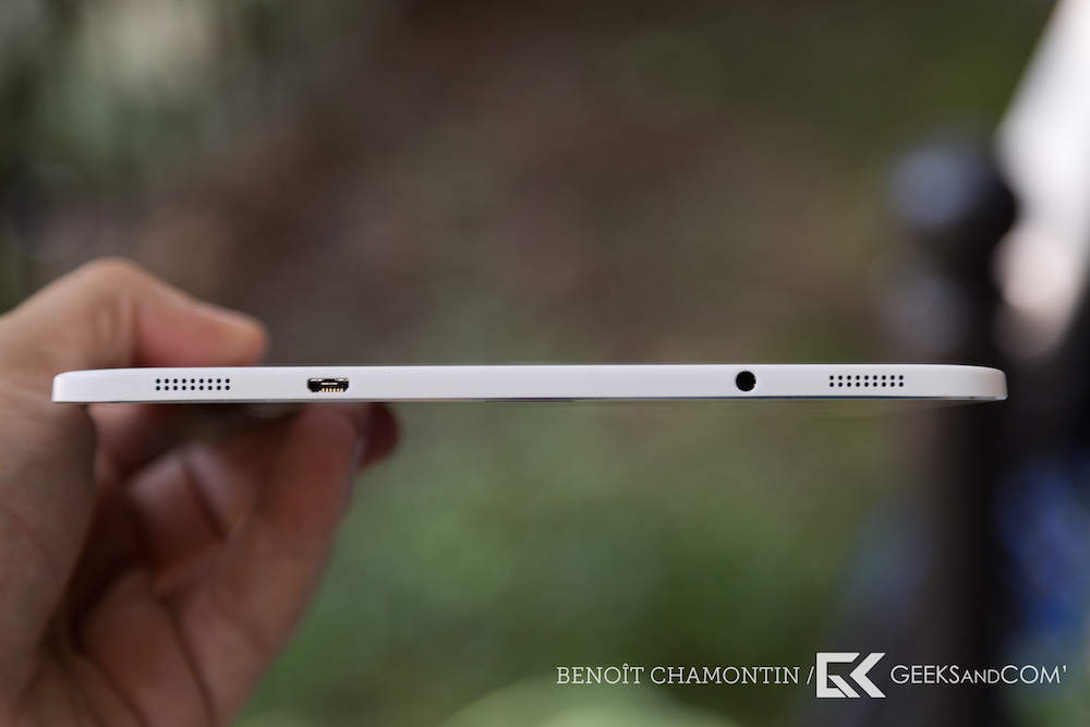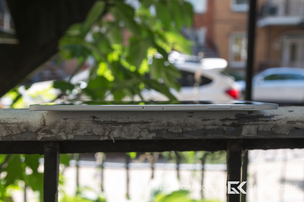 Sommairement, la tablette ressemble beaucoup à un iPad Air : elle est très fine, légère et grâce au changement de ratio de l’écran, la Tab S 2 a des dimensions similaires au produit d’Apple. Un point négatif de la tablette que l’ancienne n’avait pas est l’emplacement des haut-parleurs : la précédente génération en avait un sur le côté gauche et un autre sur le côté droit de l’écran tandis que la Tab S2, les a tous les deux sur le bord qui se retrouve en dessous lors de l’utilisation au format portrait, ce qui peut couper le son si l’on ne fait pas attention.