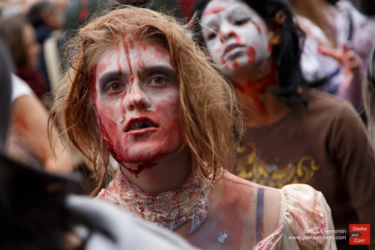 Elle aborde ainsi les marches de zombies qu’elle a vécu à Paris mais qui sont également présentes au Québec (voir nos photos de la marche des zombies 2013 de Montréal) . Voici un extrait en vidéo :