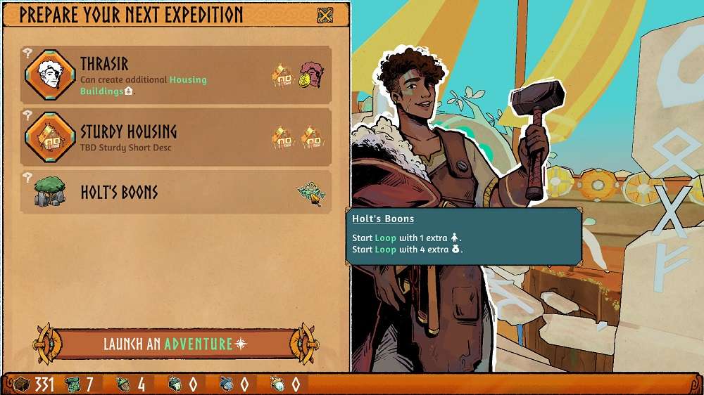 Notre base est le Holt où nous rebâtissons les colonies et où notre équipe se prépare. On va améliorer les lieux qui nous fourniront les outils nécessaires à notre expédition. Chaque voyage lance une boucle qui nous fait visiter les îles où se trouvent les ressources à recueillir pour le clan.