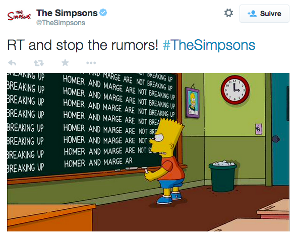 Le message est on ne peut plus clair : « Homer et Marge ne vont pas se séparer ! Re-tweetez et arrêtez les rumeurs ! ». Nous pouvons remarquer que Bart, l’enfant du couple en question, est en colère : représente-t-il les fans énervés à l’idée d’une telle séparation ; ou bien serait-il la représentation des créateurs de la série qui en auraient assez de répéter sans arrêt la même chose,comme on peut le voir sur le tableau ci-dessus, ou pour se prémunir des réactions excessives ?