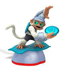 »Protecteur royal de la légendaire idole simiesque Kubla-Wa, Fling Kong s’entraîna longuement à l’art mystérieux du Monk-Ru, un art martial qui tire sa puissance de l’Air. Élève zélé, il était toujours le premier arrivé et le dernier parti. Un jour, une bande d’affreux Gorilla-Goos, menée par l’infâme général Snot, arriva au temple. Snot avait entendu parler de l’idole, et notamment du fait qu’elle était en or massif. Les bandits prirent rapidement le contrôle du temple et s’apprêtaient à mettre la main sur l’idole quand soudain, Fling Kong se mit en travers de leur route, en véritable maître du Monk-Ru ! À l’aide de son tapis volant et de ses puissants disques, il maîtrisa les Gorilla-Goos et sauva l’idole. Peu après, Maître Eon fut informé de ses actes et lui proposa de rejoindre les Skylanders. Depuis, Fling Kong déchaîne la puissance de l’Air contre tous les mécréants des Skylands ! »