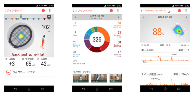 On peut alors analyser son jeu avec différents schémas et graphes notamment la vitesse de la balle, la force de la frappe, le type de frappe et les zones de frappe. Il est également possible de superposer les données recueillies avec une vidéo de nos échanges pour compléter son analyse.