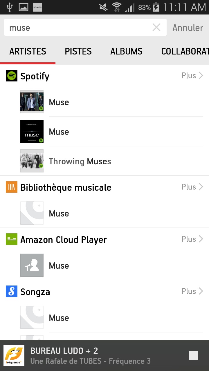 La recherche universelle (artistes, albums et pistes à travers les différents services de musique) propose maintenant de chercher également dans la musique qui est stockée dans son appareil.
