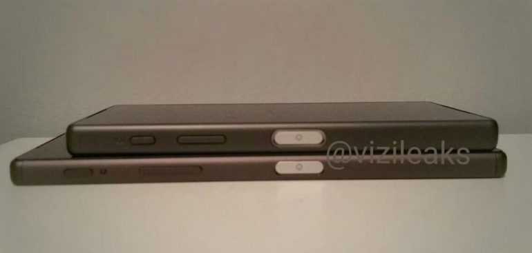 Une deuxième photo des Sony Xperia Z5 et Z5 compact nous montrent les deux téléphones sur leur tranche et on notera alors le changement de design du bouton allumer / éteindre. Celui-ci n’est plus rond et en relief, mais plat et bien plus large. Ainsi, cette modification du bouton allumer / éteindre ferait en sorte qu’il intègre directement le lecteur d’empreinte digitale dans cet espace. Un positionnement très intéressant en terme de prise en main si cela se vérifie bien lors de la présentation des Xperia Z5 et Z5 compact par Sony.