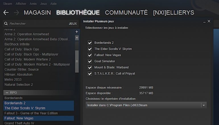 En effet, la dernière version Bêta du client Steam permet de lancer plusieurs installations de jeux simultanément à partir de la même fenêtre. Pour cela, il faut aller dans sa bibliothèque Steam et sélectionner les différents jeux que vous souhaitez installer avec le clic gauche de votre souris tout en maintenant le bouton Ctrl (ou Shift sur OS X) de votre clavier. Vous pouvez alors faire un clic droit sur l’un des jeux sélectionnés et choisir installer.