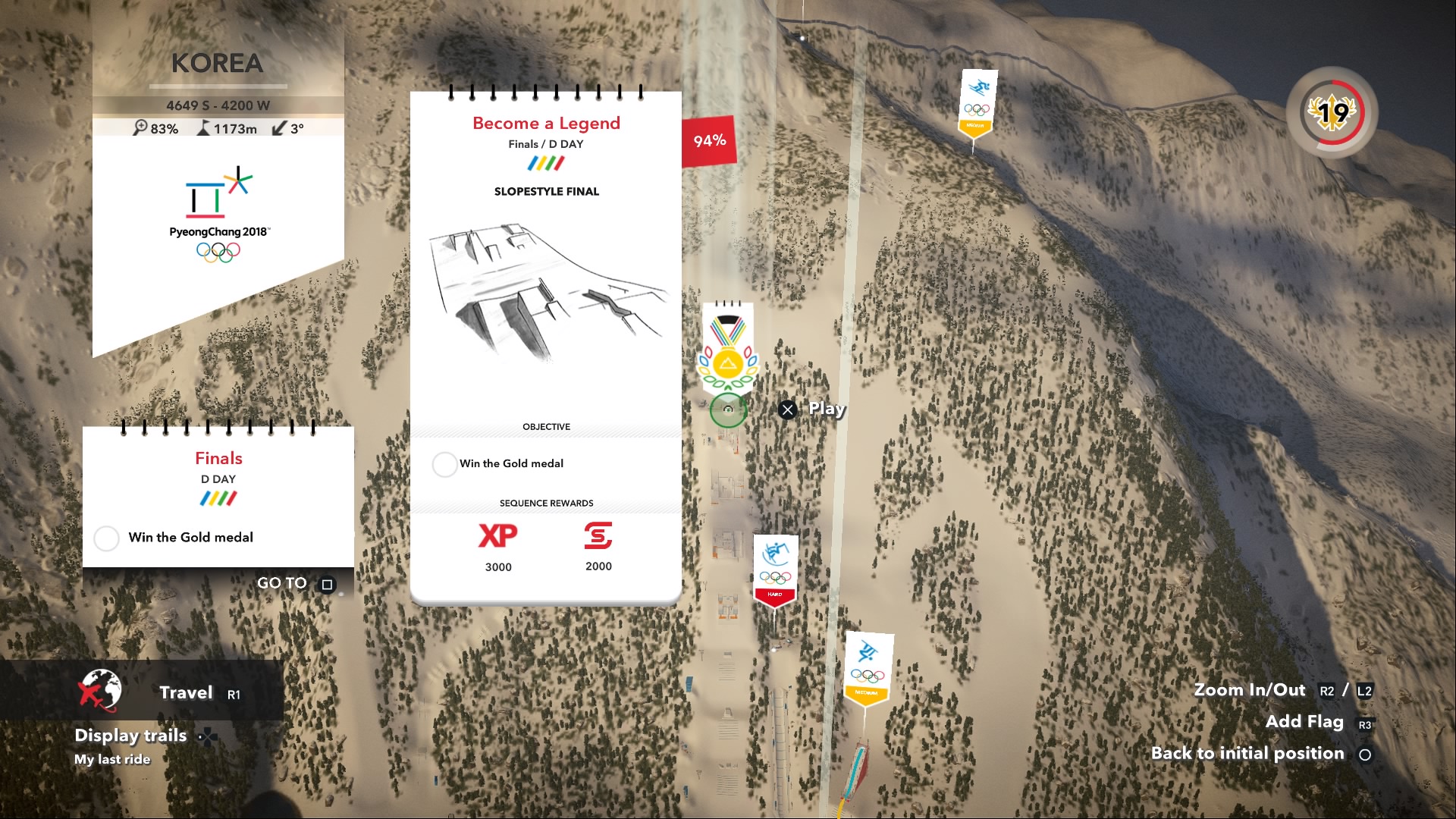 Ce mode carrière relate les mois de préparations et de qualifications pour se rendre au Jeux. Donc, nous participons à une série de missions comprenant des entraînements et des compétitions qui vont finalement nous amener vers PyeongChang. Comme mentionné plus tôt, anciennement, Steep ne comportait que les versants de montagnes des Alpes. Avec les contenus téléchargeables apparus au courant des derniers mois, notamment celui qui nous intéresse ici, d’autres lieux de glisse sont disponibles. Notamment, les préparations et compétitions de Road to the Olympics se déroulent en Corée du Sud (bien évidemment), mais également au Japon.