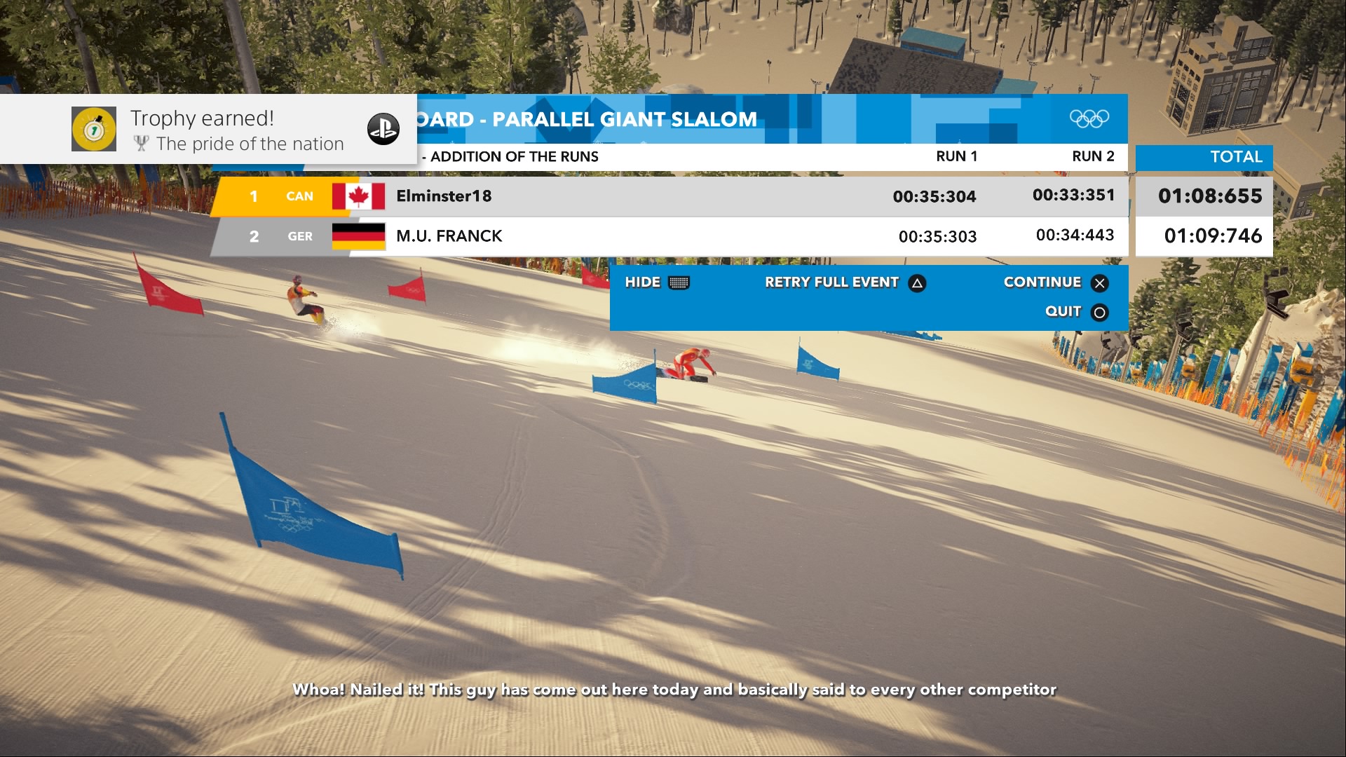 Pour les compétitions olympiques, l’expérience globale est une toute autre chose… Je me suis fait prendre à recommencer souvent les épreuves pour essayer de gagner des médailles d’or, mais, par moment, c’était tout simplement de l’acharnement de ma part. À mon avis, le plus gros problème provient des contrôles imprécis présents dans Steep. Lorsqu’il s’agit d’épreuves de freestyle, on peut pallier à l’imprécision par la difficulté des mouvements que nous exécutons, mais dans le cas des différents types de slalom c’est tout simplement frustrant. En effet, dans ce type de compétition, la précision est essentielle pour être en mesure d’effectuer le meilleur temps ou tout simplement, ne pas manquer les portes.