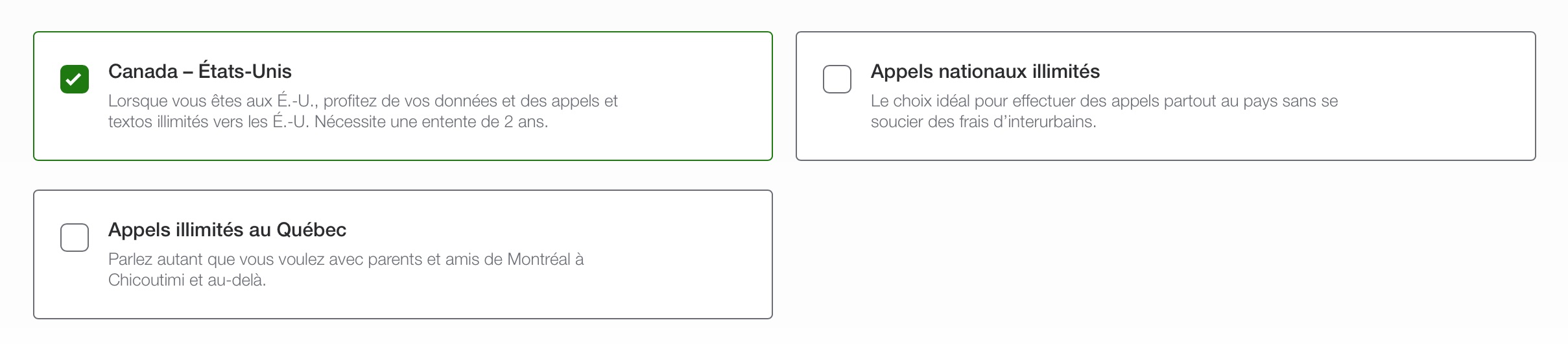 L’option Canada – États-Unis de Telus coûte 10$ de plus que l’option Appels illimités au Québec et 5$ de plus que l’option Appels nationaux illimités. Il comprend les appels et les messages texte illimités vers les numéros au Canada et aux États-Unis, ainsi que l’utilisation du lot de données du client au Canada et aux États-Unis.