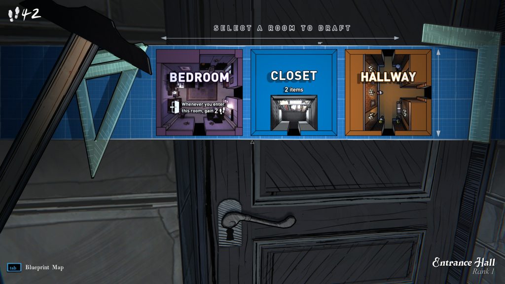 Ce qui démarque le plus Blue Prince des autres jeux d’aventure et d’énigmes est sa la manière dont on y joue. Tout d’abord, il s’agit d’une expérience en vue à la première personne. Il n’y a pas de didacticiel à proprement parler. C’est-à-dire que le studio explique bel et bien les touches, mais il faut apprendre nous-mêmes ce que l’on doit y faire grâce aux indices dissimulés. Au départ, on se retrouve dans le hall du manoir. Trois portes s’offrent à nous et il faut prendre une décision. Bien entendu, celle-ci n’est pas définitive et il sera totalement possible d’explorer les autres passages. Une fois que l’on sélectionne une porte, nous devons choisir, parmi une sélection restreinte, la salle que nous allons avoir. Chaque pièce permet d’avancer dans le jeu, mais aussi de récupérer des objets importants pour la suite.