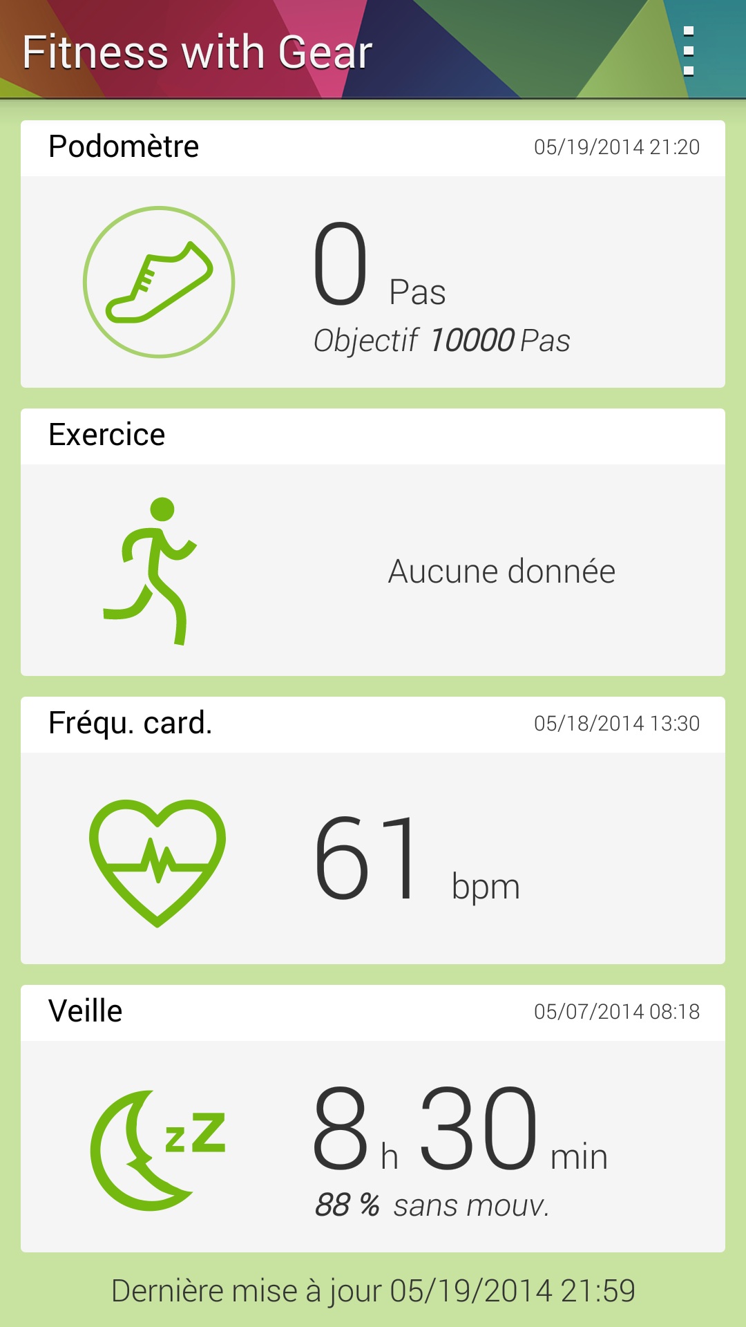 Une deuxième application s’installe automatiquement lorsque le bracelet effectue sa mise à jour : « Fitness with Gear ». Celle-ci se concentre sur les activités physiques réalisées avec le bracelet, et offre des statistiques plus détaillées ainsi qu’un journal de progression. Il est par ailleurs très difficile de faire synchroniser les données du bracelet avec ces applications ou des applications tierces. Par exemple, la synchronisation du nombre de pas ne s’effectuait pas toujours et je ne suis jamais parvenu à partager ces données avec RunKeeper ou Endomondo, ce qui aurait été pratique.