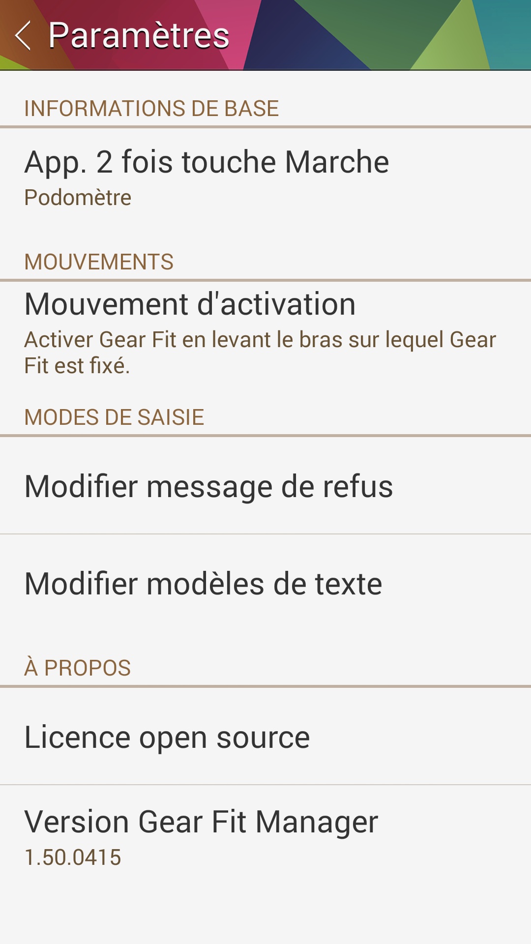 L’application « Gear Fit Manager » est une version simplifiée du Gear Manager, dédié aux montres. Celle-ci propose quelques réglages de base, comme le thème d’horloge du bracelet, les notifications que l’on souhaite recevoir ainsi qu’un suivi de l’activité physique.