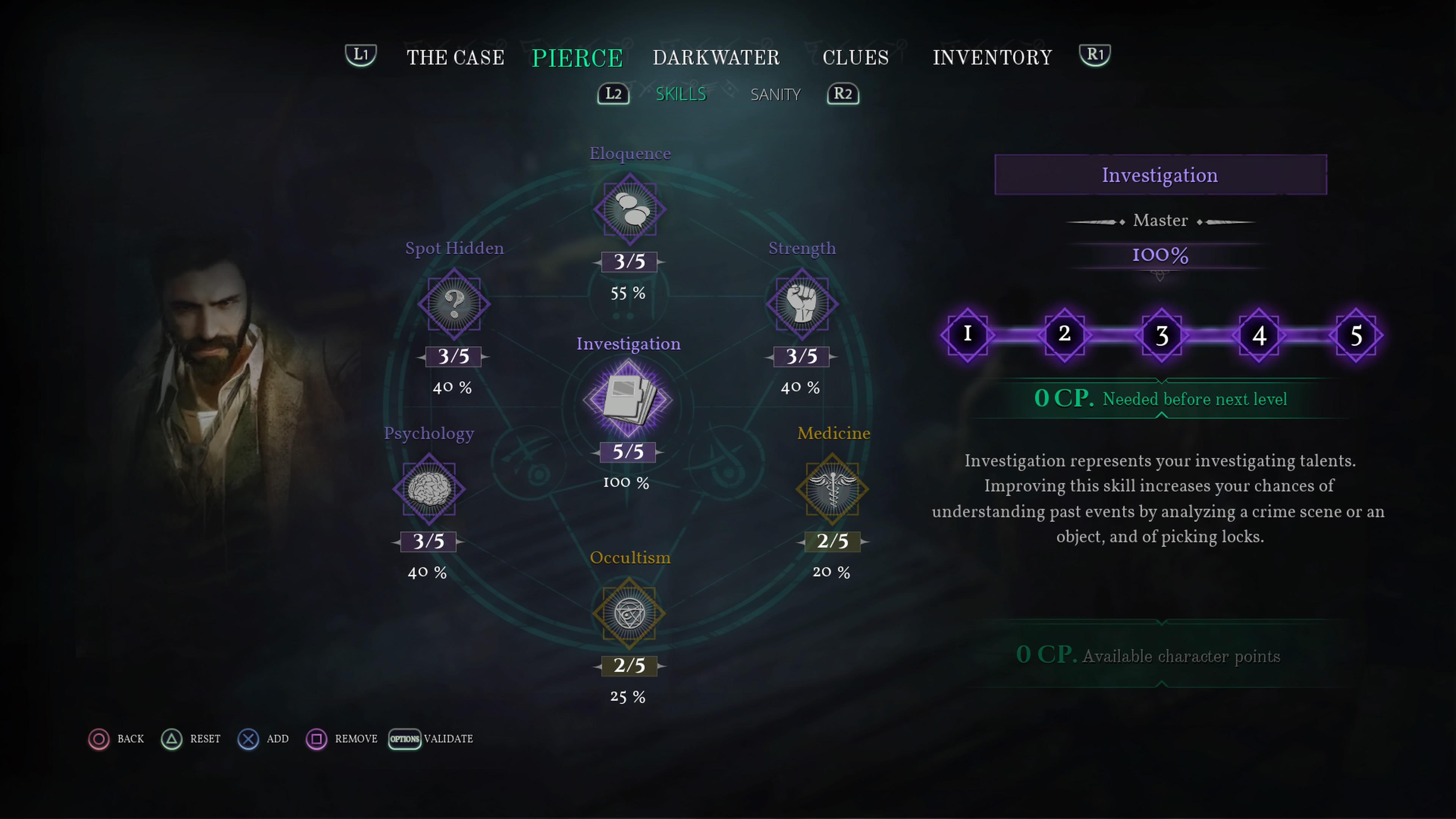 Ensuite, il y a tout l’aspect RPG qui a été très bien développé. Grâce à celui-ci, chaque joueur peut décider le genre de Pierce qu’il pourra promouvoir. J’ai donc opté pour mettre tous mes points dans mes talents d’investigations en premier. Ainsi, mon protagoniste est rapidement devenu un expert pour comprendre une scène de crime ou analyser un objet. C’est celui-ci qui m’a permis de débloquer quelques portes autrement inaccessibles. Une fois maximiser, je me suis retourné vers l’éloquence pour plus facilement influencer les autres. J’aurais pu aussi développer mon côté psychologue, ma force physique ou mon habileté à découvrir des objets cachés. C’est en choisissant différents talents qu’on finit par découvrir toutes les fins du scénario.