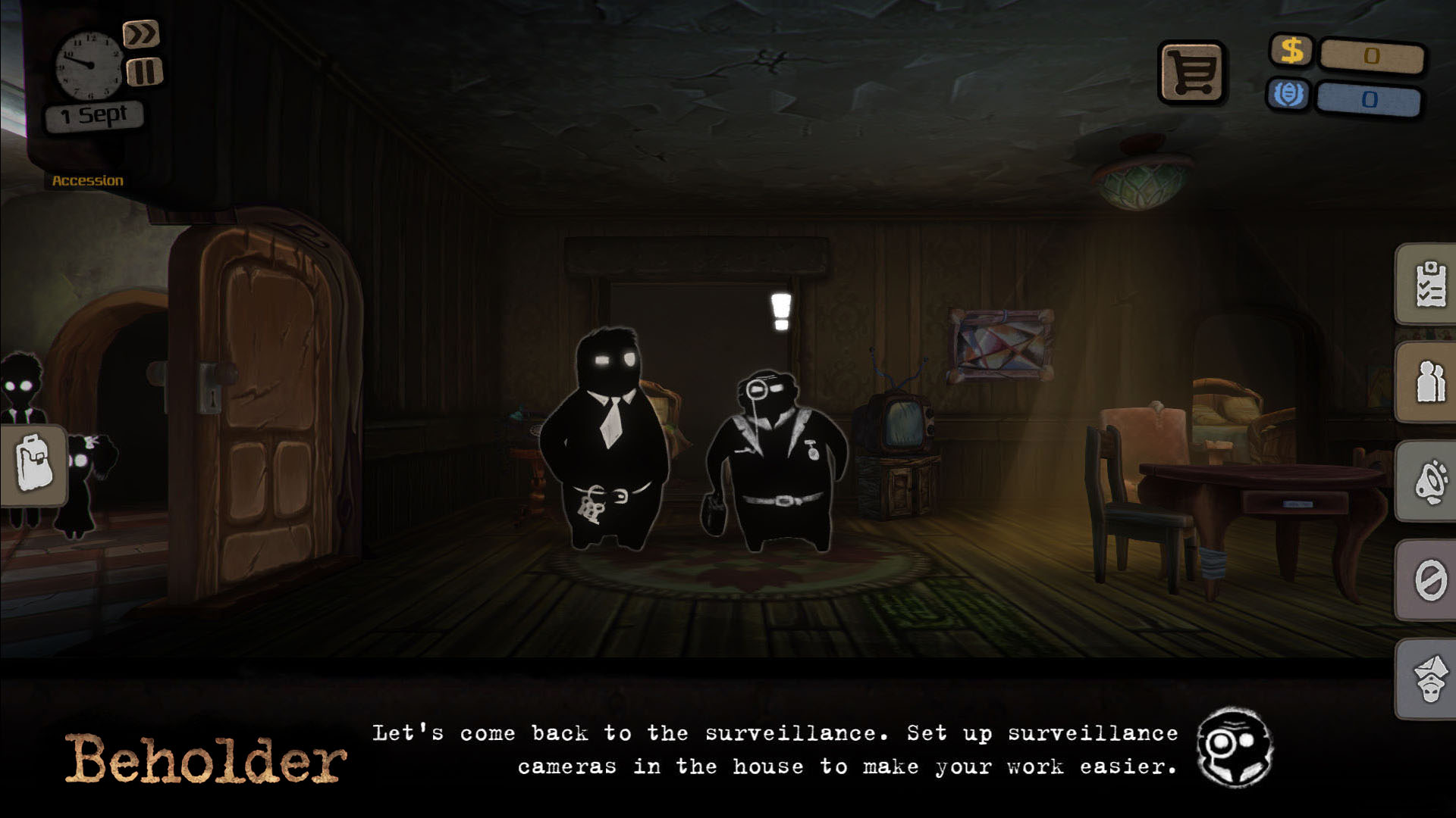 Au niveau du graphisme, les développeurs de chez Warm Lamp Games ont choisi d’utiliser un visuel très approprié pour le genre de boulot un peu louche que votre protagoniste pratique dans Beholder. C’est-à-dire que chaque personnage est complètement peint en noir comme si on voyait seulement leur ombre se déplacer. Tout ce qu’on peut vraiment distinguer c’est leur habit et leur visage défini par des lignes blanches. C’est aussi parfait pour nous démontrer à quel point les habitants vivent dans un univers assez sombre où ils n’ont pas d’autres choix que subir ce que le régime totalitaire veut leur imposer.
