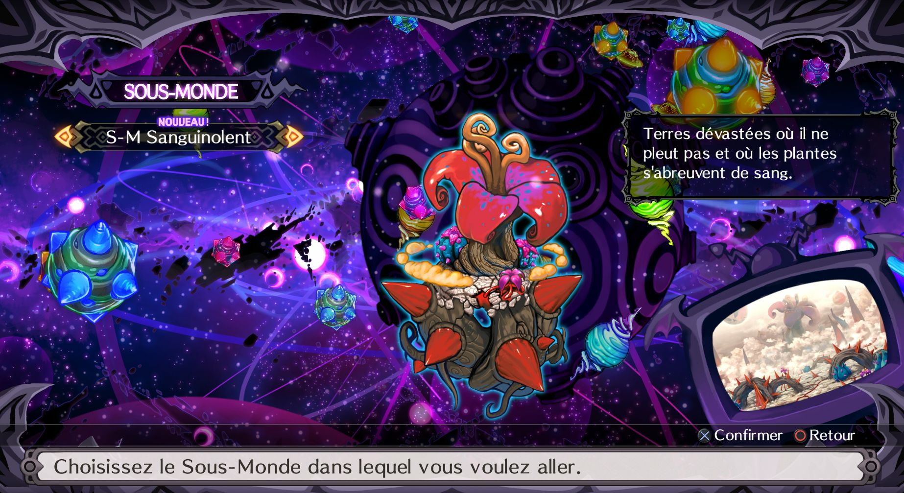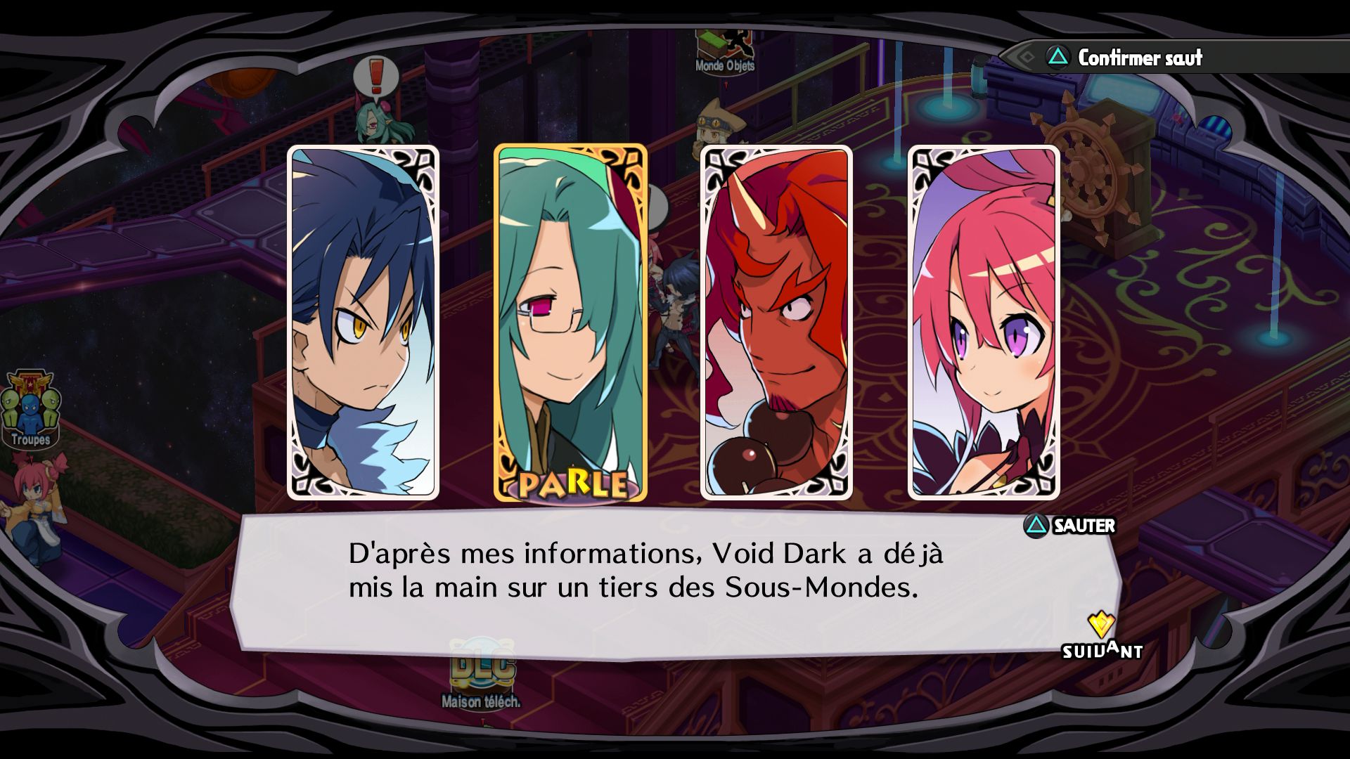 Habitués de la licence, vous êtes en territoire conquis ! Votre Hub, point névralgique de chaque Disgaea, se trouve être désormais le Netherworld de Seraphina, le Sous-Monde Glamoureux. D’ici vous pourrez avancer dans le scénario tout en accédant à tous les services prérequis pour votre progression : hôpital, armurerie, missions annexes, magasin d’objets, recruteur, et autres joyeusetés, sont de la partie.