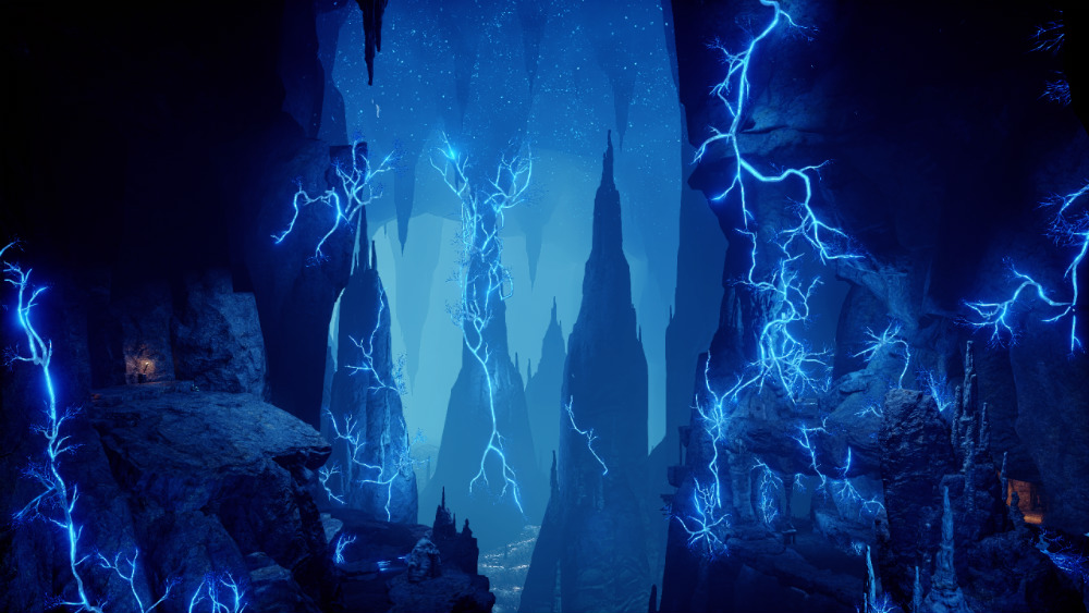 Je retiens particulièrement la séquence au tout début de la deuxième partie du DLC, où nos héros arrivent dans les abysses ou règne une obscurité totale. Ils aperçoivent alors des yeux les observer, puis s’enfuir. Seuls les bruits de pas résonnent. A partir de cet instant, la situation change et la direction artistique prend une direction légèrement différente. Les ruines laissent place à des paysages plus majestueux, plus lumineux, et on a alors vraiment l’impression de parcourir un territoire vierge.