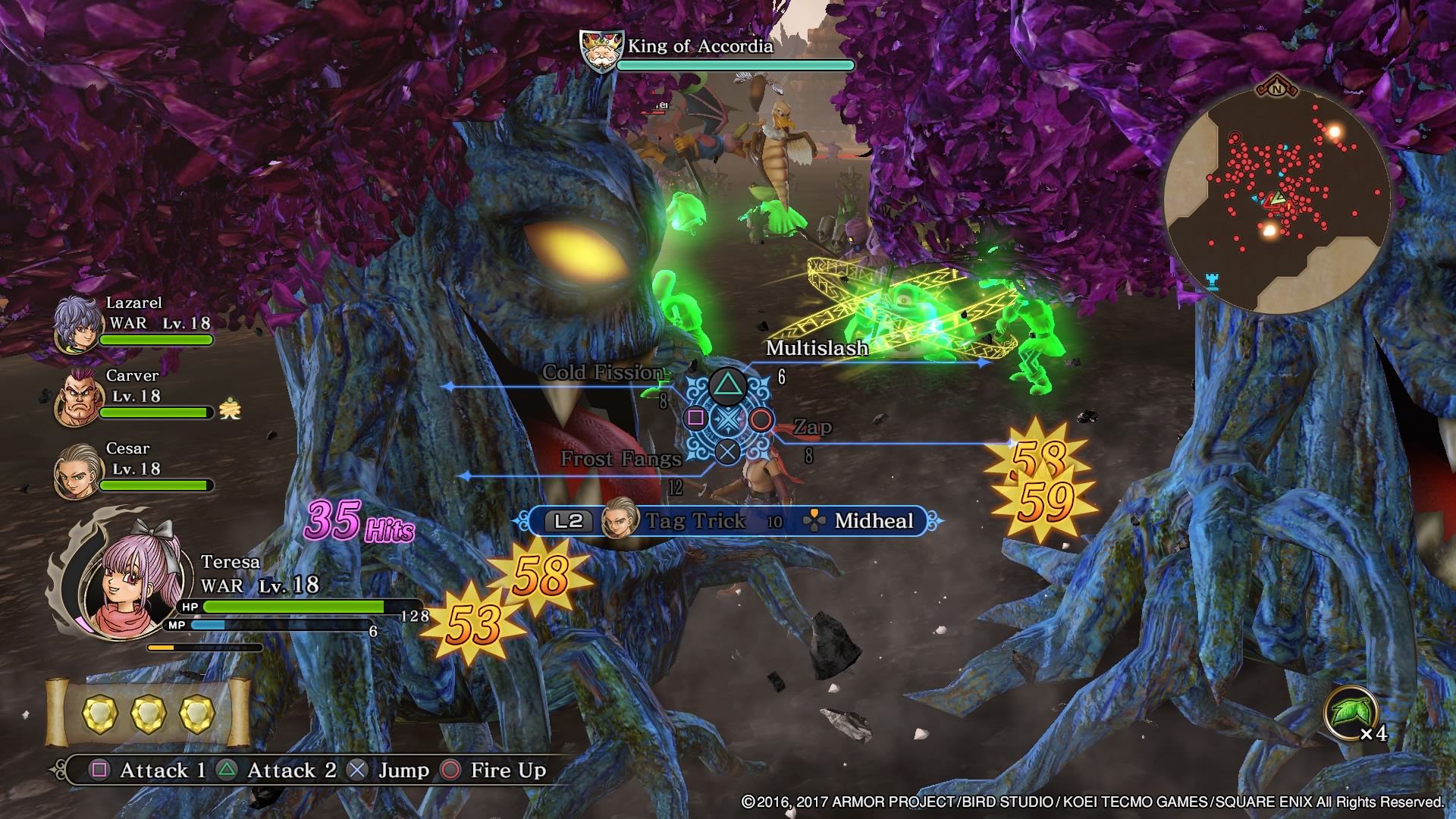 Un autre problème persiste quant à ces personnages secondaires. Ils sont trop souvent inutiles lors des combats. En fait, leur utilité se résume surtout à résoudre des quêtes et à réanimer les deux personnages principaux. En effet, la partie RPG du jeu a tendance à rendre les deux personnages principaux plus fort que les autres. Simplement après avoir débloqué le « multislash » et toutes ses variantes pour Lazarel, le sort des autres personnages est scellé. Cette capacité permet de donner plusieurs coups en quelques secondes, tant que nous avons des points de magie ou que nous avons activé la « Haute Tension ». Cette aptitude déjà présente dans le premier opus permet d’activer les capacités de manière illimitée pendant quelques secondes. De quoi rendre les combats plus faciles et surtout, plus redondants.