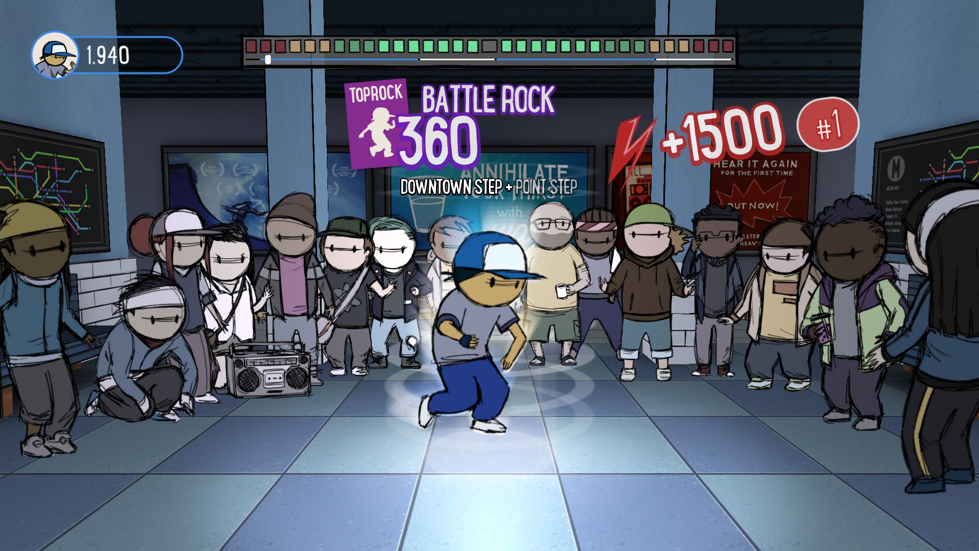 Le principe de Floor Kids est très simple. Enchaîner vos plus beaux mouvements de danse afin d’accumuler le plus de points possible. Pour ce faire, le titre propose plusieurs styles de mouvements, mais également de musiques. Bien entendu, les développeurs conseillent fortement de jouer avec une manette et j’aborde dans le même sens. Une fois votre manette en main, vous devez cliquer sur une ou plusieurs touches simultanément afin de réaliser des mouvements. Afin de remporter encore plus de points, vous devez appuyer au rythme de la chanson. Votre pointage final déterminera le nombre d’étoiles que vous obtenez sur le niveau. Ce dernier est étroitement lié aux niveaux que vous pouvez débloquer par la suite. De plus, avoir le meilleur score est aussi un bon moyen de remporter de nouveaux danseurs avec des talents différents ou encore de nouveaux mouvements de danse. De mon côté, j’ai trouvé que le titre entre rapidement dans la répétitivité. Une fois que les combos de bases sont appris, nous n’avons pas besoin de nous inquiéter et nous allons débloquer le contenu assez rapidement sans trop de difficulté. Il aurait été intéressent à mon avis d’ajouter encore plus de musique, de faire des collaborations avec d’autres DJ et d’offrir un catalogue de mouvements plus variés. Néanmoins, les sensations sont présentes et j’ai pris du plaisir à parcourir les différents niveaux.