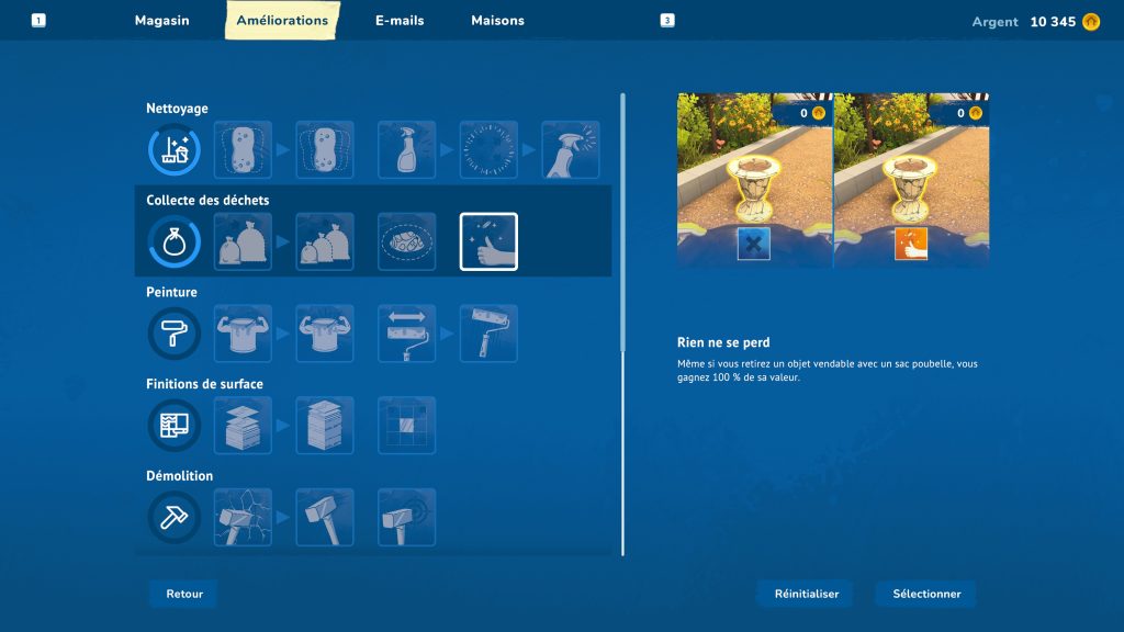 House Flipper 2 propose aussi toujours un système d’arbre de compétence qui permet d’améliorer notre confort. J’ai bien apprécié les petits changements qui permettent désormais de choisir précisément ce que l’on souhaite améliorer. Les habitués ne seront pas dépaysés alors qu’il suffit d’accomplir des tâches dans une certaine catégorie pour obtenir un point de compétence pour améliorer cette dernière.
