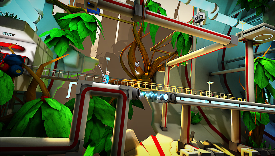 L’univers du jeu est plutôt mignon et peut convenir à tout âge. L’histoire se déroule dans un futur où l’humanité semble avoir disparue. Kick se réveille après ce qui semble être une longue stase, et rencontre Fennick qu’il voudra sauver, après que celui-ci lui ai d’abord sauvé la vie. Le design des deux protagonistes est assez enfantin mais attachant. L’amitié entre les deux est assez bien représentée à l’écran. En revanche, cet univers n’est pas vraiment exploité, il s’agit plus d’un contexte, l’intérêt principal du jeu réside dans son gameplay. Je ne considère pas que ce soit un défaut, néanmoins certains pourront éprouver une petite déception.