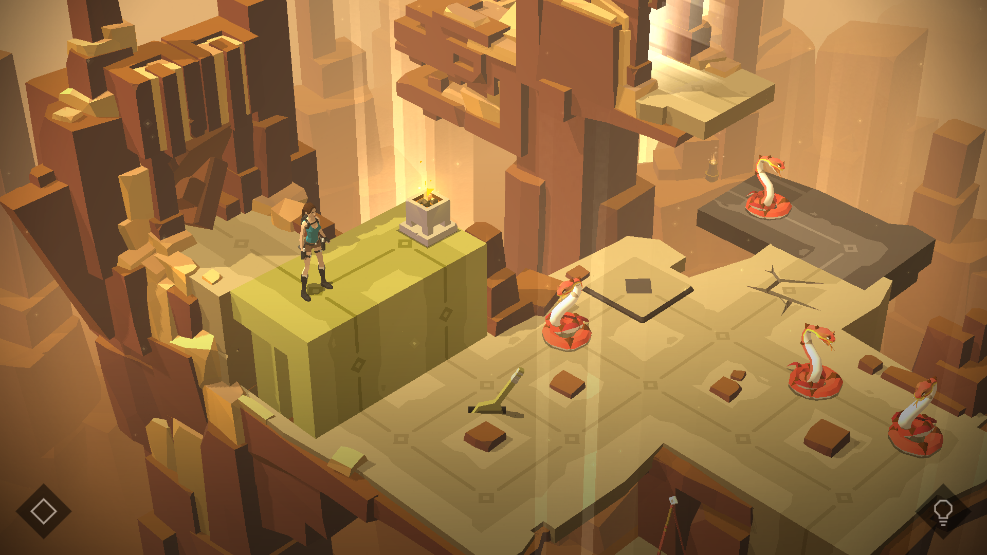 On l’a vu, le level design de Lara Croft Go est assez brillant,mais il n’est pas seul. Les éléments composant ces niveaux participent de la réussite globale de l’expérience. Tout un bestiaire a été pensé pour vous mettre la misère : dragons de komodo, serpents, araignées plus que géantes, toutes les bestioles ont un point faible et un comportement particulier. Les serpents craignent le feu des torches, les obligeant à reculer, les dragons de komodos suivront le parcours de Lara, et les araignées se situent dans un entre deux. Dans tous les cas, l’attaque frontale sera synonyme de mort et de retour à la case départ. Le jeu parvient même à leur faire dépasser le statut d’ennemis mortels. En effet, lors de certaines énigmes, ils faudra jouer avec le déplacement des animaux pour soit être capable de les allumer grâce aux deux 9mm que possède l’héroïne, soit leur faire activer différents mécanismes afin de progresser.