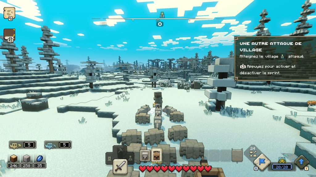 Minecraft Legends souhaite malgré tout rester le plus accessible possible. Ce n’est rien de surprenant alors que la communauté de la franchise comporte autant de joueurs aguerris que de néophytes. Pour nous aider, trois gardiens de l’Overworld, appelés Hôtes, nous guident dans cette aventure. Il s’agit d’une manière d’ajouter au fur et à mesure les fonctionnalités sans brusquer le joueur. L’interface est rapidement surchargée d’information et la campagne est primordiale pour comprendre chaque aspect de l’aventure. Il y a également plusieurs options d’accessibilités.