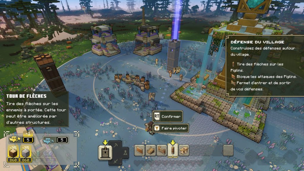 Comme indiqué dans l’introduction de ce test, Minecraft Legends est un jeu d’action et de stratégie. Avec sa vue à la 3e personne, notre personnage doit donner des ordres à ses alliés pour vaincre les différentes menaces. Cependant, vous avez un nombre limite d’alliés et il faut parfois sortir votre épée pour renverser une bataille. Le titre propose aussi tout un système de récolte de ressource inspirée du jeu original. Les objets collectés permettent d’améliorer votre village principal, créer de nouveaux bâtiments pour défendre les villageois, mais aussi invoquer des monstres pour vous aider. Chaque type d’unité n’a pas la même efficacité et il faut choisir les bons alliés. Certaines créatures ont plus de facilité à détruire les bâtiments ennemis tandis que d’autres sont spécialisés dans l’élimination des piglins. La diversité est, d’ailleurs, bien présente autant de notre côté que celui de l’ennemi. On retrouve une très bonne variété.