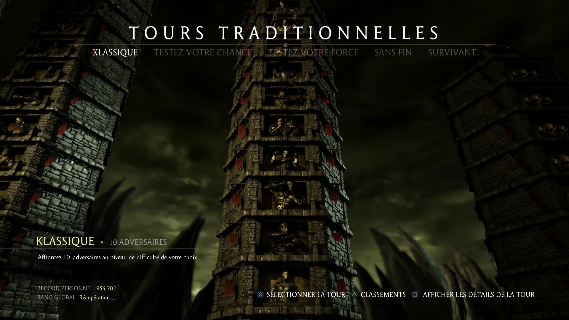 Instaurées sur MK9, les tours sont de retour et se divisent en plusieurs catégories : les tours klassiques où il faut battre 10 ennemis, les tours « testez votre chance » où les combats se déroulent avec des modificateurs (ajouts de missiles, vitesse accrue, pas d’X-Rays, armures, poison, etc) puis il y a les tours infinies où il faut tenir le plus longtemps sans perdre et pour finir la tour « testez votre force » sans grand intérêt où le but est juste de smasher 4 boutons pour casser un objet (bonne chance pour le dernier).