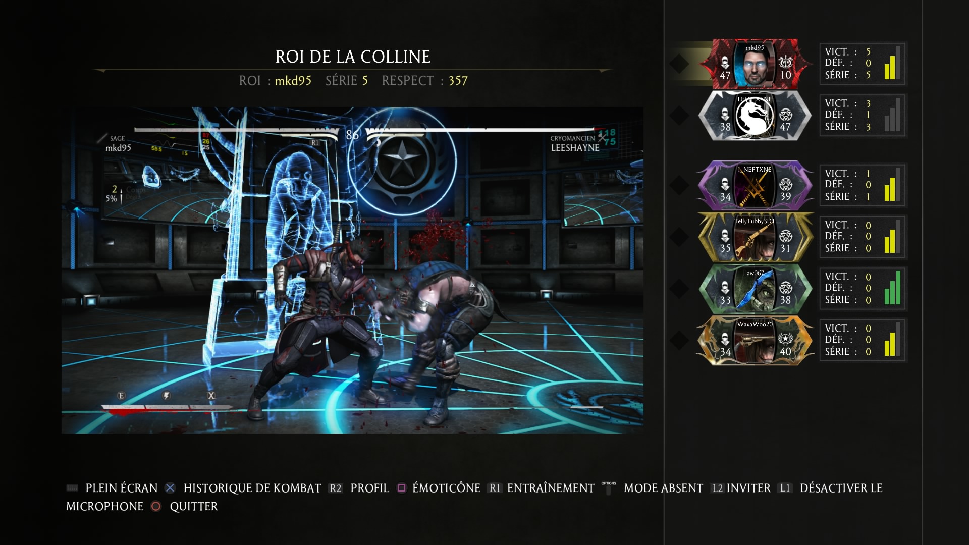 Concernant les modes, on se retrouve avec les salles pour rejoindre un groupe de personne, les versus classiques avec classement ou non, les modes en équipes 3vs3 ou 5vs5 (les joueurs s’affronte en 1vs1 et un match donne un point pour l’équipe), roi de la colline où l’objectif est de rester le roi pour continuer à jouer pendant que les autres essayent de prendre sa place à tour de rôle tout en regardant le match et puis il y a les kombats de tours où les joueurs doivent finir le plus rapidement possible la tour pour être le gagnant.