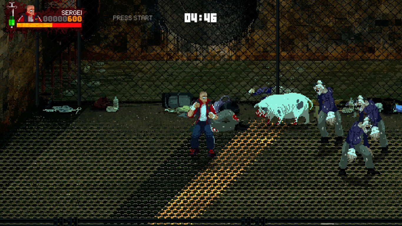 Comme son nom l’indique, Mother Russia Bleeds est un beat’em up très violent et est réservé à un public averti. Même si l’inspiration première provient de jeux tels que Streets of Rage ou encore Double Dragon, le titre développé par Le Cartel ne se restreint pas en ce qui concerne l’hémoglobine. Le jeu propose aux joueurs d’éliminer ses ennemis de nombreuses façons même si à la surface les attaques sont très simples. On ne retrouve pas de combos très compliqués. L’offensive de notre personnage est basée sur les coups de poing, les attaques sautées ou encore la possibilité d’attraper et de lancer son adversaire. Les développeurs ont également inséré divers objets afin de diversifier au maximum les combats qui peuvent devenir extrêmement répétitifs dans ce genre de jeu. En plus des armes, la Nekro a un rôle très important. Elle devra être utilisée pour vous soigner, mais aussi pour activer le mode furie de votre personnage. Ce mode permet d’augmenter largement la rapidité des attaques et d’être plus résistant pendant un court instant. Votre jauge de Nekro n’est pas infinie et il vous faudra récupérer ce précieux liquide avec une seringue sur le corps de vos ennemis. Si vous souhaitez lâcher votre agressivité dans Mother Russia Bleeds, il est tout à fait possible de le faire facilement et rapidement.