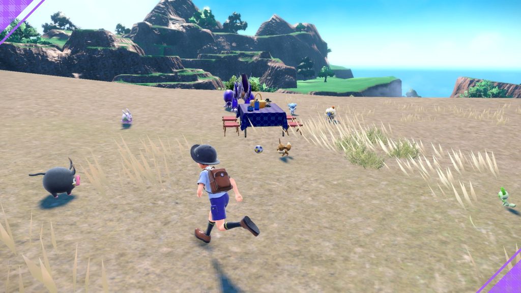 Passons maintenant au monde ouvert puisqu’il fait aussi partie de la jouabilité. Le fait d’avoir une monture et de pouvoir voler aux points d’intérêts déjà visiter sert beaucoup l’exploration. Franchement, le monde de Paldea est vraiment très vaste. Beaucoup plus que les différents mondes qu’on visite dans Arceus. Les Pokémons sont aussi un petit peu mieux éparpillés et mieux mélangés. C’est juste dommage qu’ils n’interagissent pas vraiment entre eux.