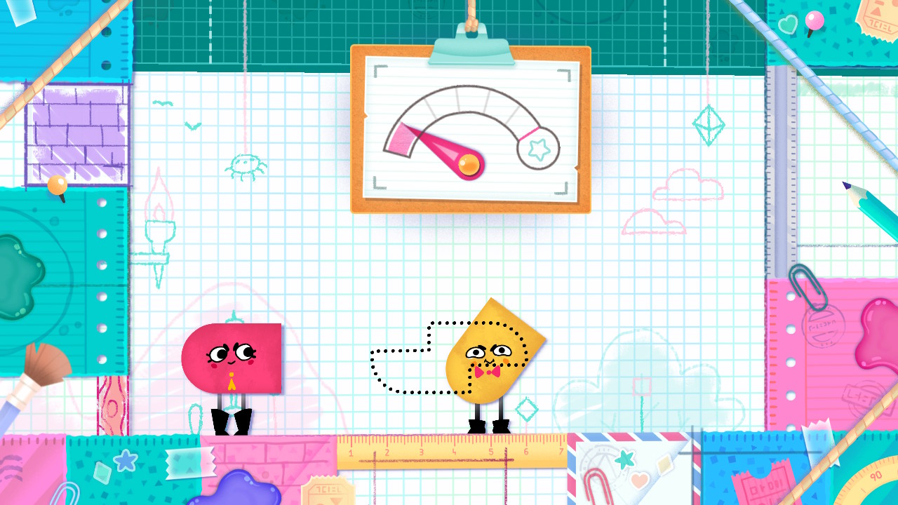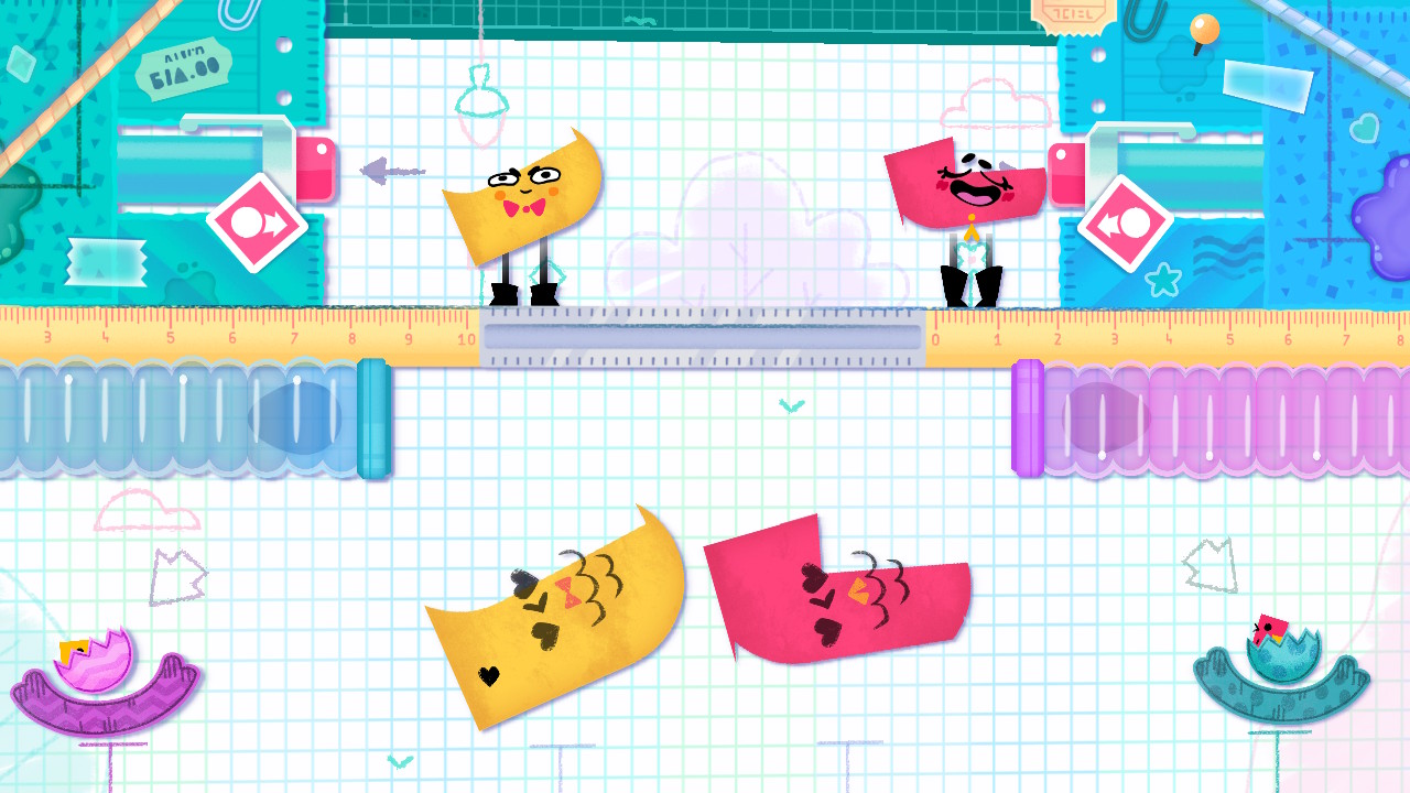 Snipperclips se joue en équipe de 1 à 4 joueurs, mais l’expérience est évidemment toujours plus amusante lorsque vous n’y jouez pas seul. Dans le mode de jeu principal, les joueurs contrôlent Snip et Clip dont les corps possèdent une forme qui peut être tourné sur elle-même. Lorsque les deux personnages se chevauchent, un peu découpez son ami aux endroits où les deux se croisent pour altérer la forme du corps. C’est grâce à cette amusante mécanique que les joueurs doivent réussir à trouver des manières créatives pour compléter les nombreux casse-têtes placés sur leur chemin. Vous aurez donc trois mondes à visiter possédant chacun 15 niveaux à compléter pour un total de 45 tableaux en plus du mode « Party » et des mini-jeux. Il y a même quelques tableaux de plus pour les équipes de deux ou plus. Bref, vous ne risquez pas de manquer de contenu.