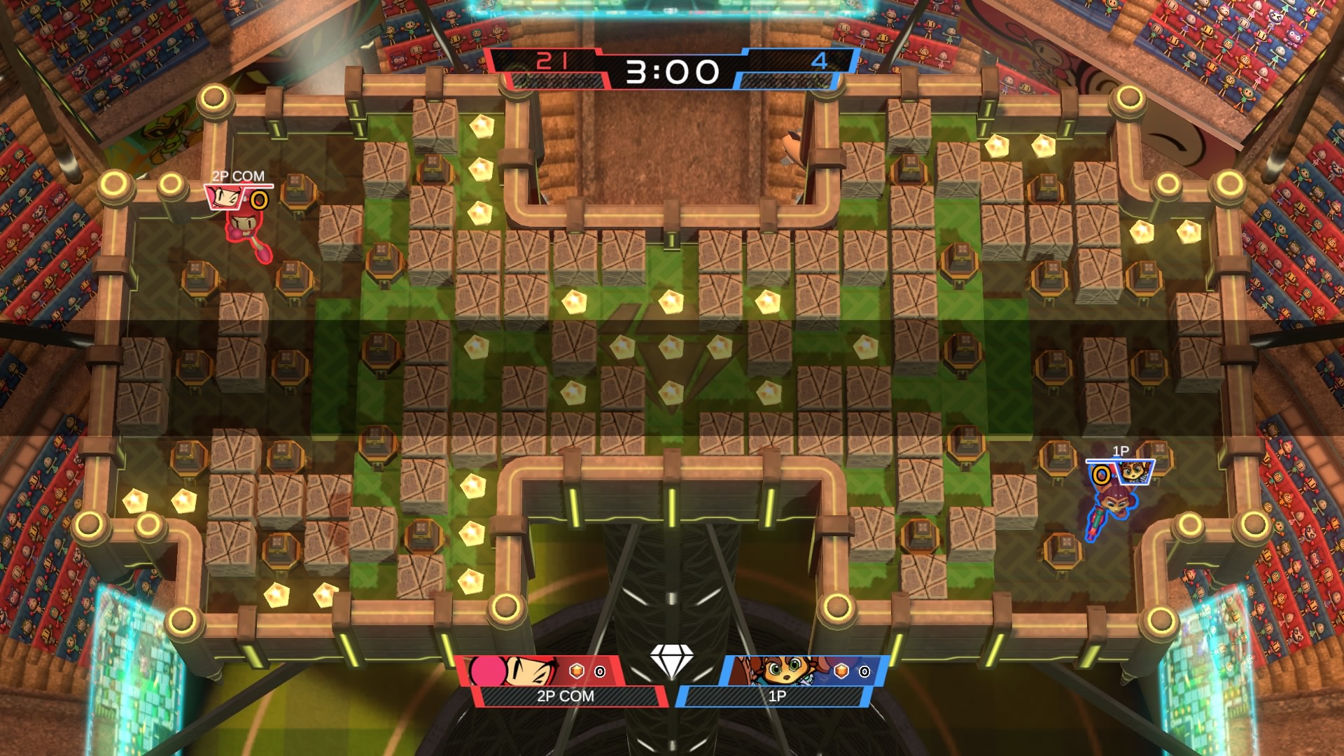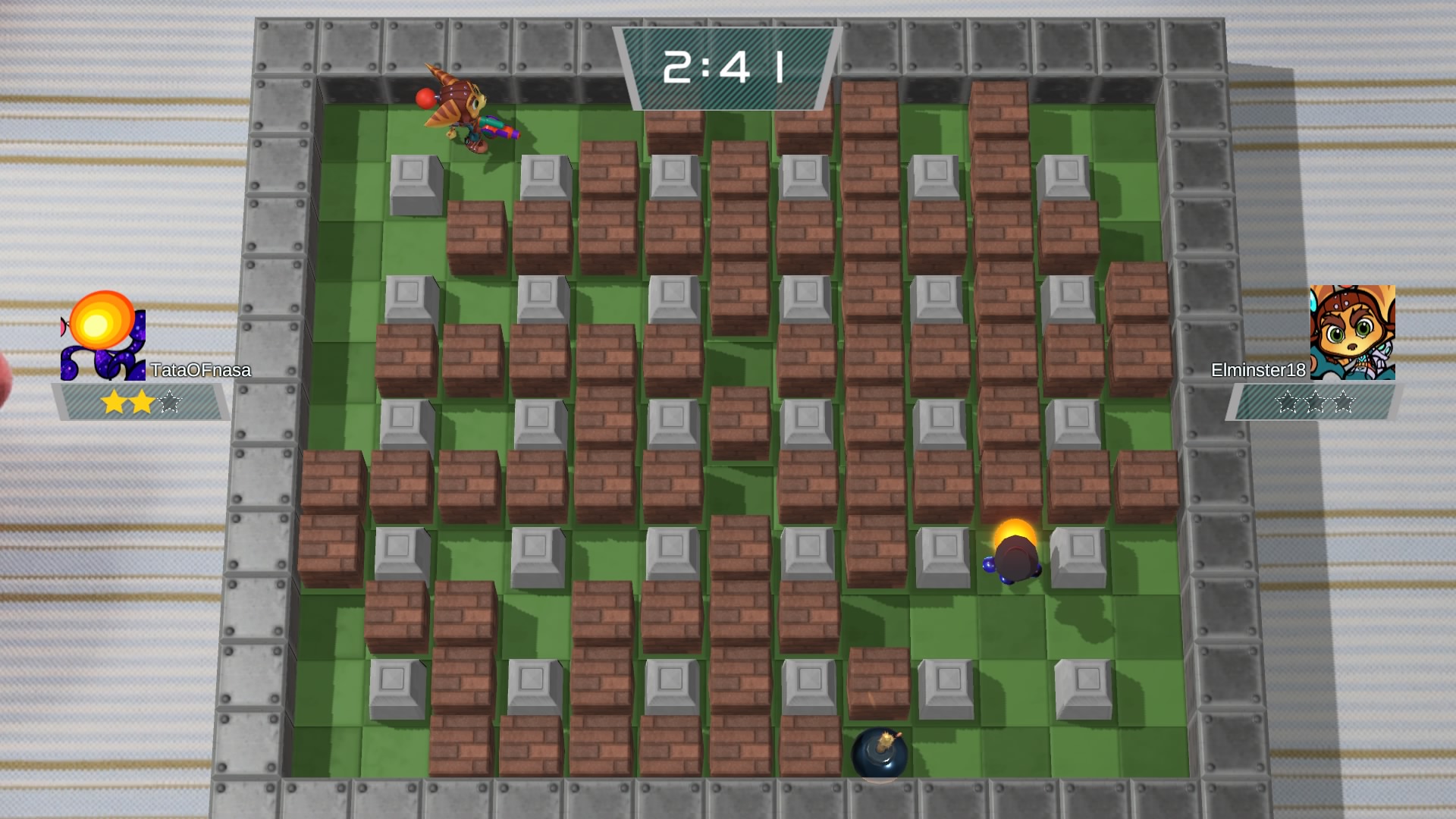 Tout d’abord, les quelques fois que j’ai essayé de trouver des matches en ligne, je n’ai à peu près pas pu en trouver. Notamment, le mode classé où le jeu est supposé nous placer avec des joueurs de notre calibre, ne fonctionnait juste pas; je n’ai pas pu jouer une seule partie. En match rapide, j’ai réussi à trouver deux matches dans mes 3 séances de jeu où j’ai essayé le mode en ligne. Toutefois, ces dernières se sont avérées très décevantes étant donné que je n’arrivais qu’à trouver qu’un seul adversaire. Qui dit Bomberman en multijoueur, dit des combats intenses à quatre joueurs.