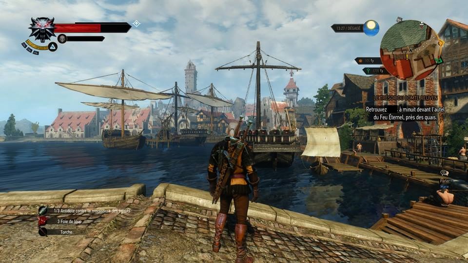 Les menus ont été revus par rapport à The Witcher 2 et heureusement. Fini les menus en listes inadaptés aux PC et pénibles sur console. Vos équipements sont rangés dans un inventaire en case et divisés selon leur nature : armes, éléments d’alchimie, objets divers et objets de quêtes. Un onglet d’artisanat assez simple d’utilisation est également présent, tout comme un menu de quêtes compréhensible. Le menu personnage quant à lui, vous présente les arbres de compétences, divisés en quatre, sous divisés en spécialités. S’il est plus clair, le menu reste toutefois assez brouillon et sa prise en main reste agaçante, les patchs ne changeant rien pour le moment. La fiche personnage vous permet de gérer l’évolution de Geralt puis que c’est là que vous trouverez les compétences à déverrouiller via des points gagnés en découvrant des obélisques de puissance ou en gagnant des niveaux.