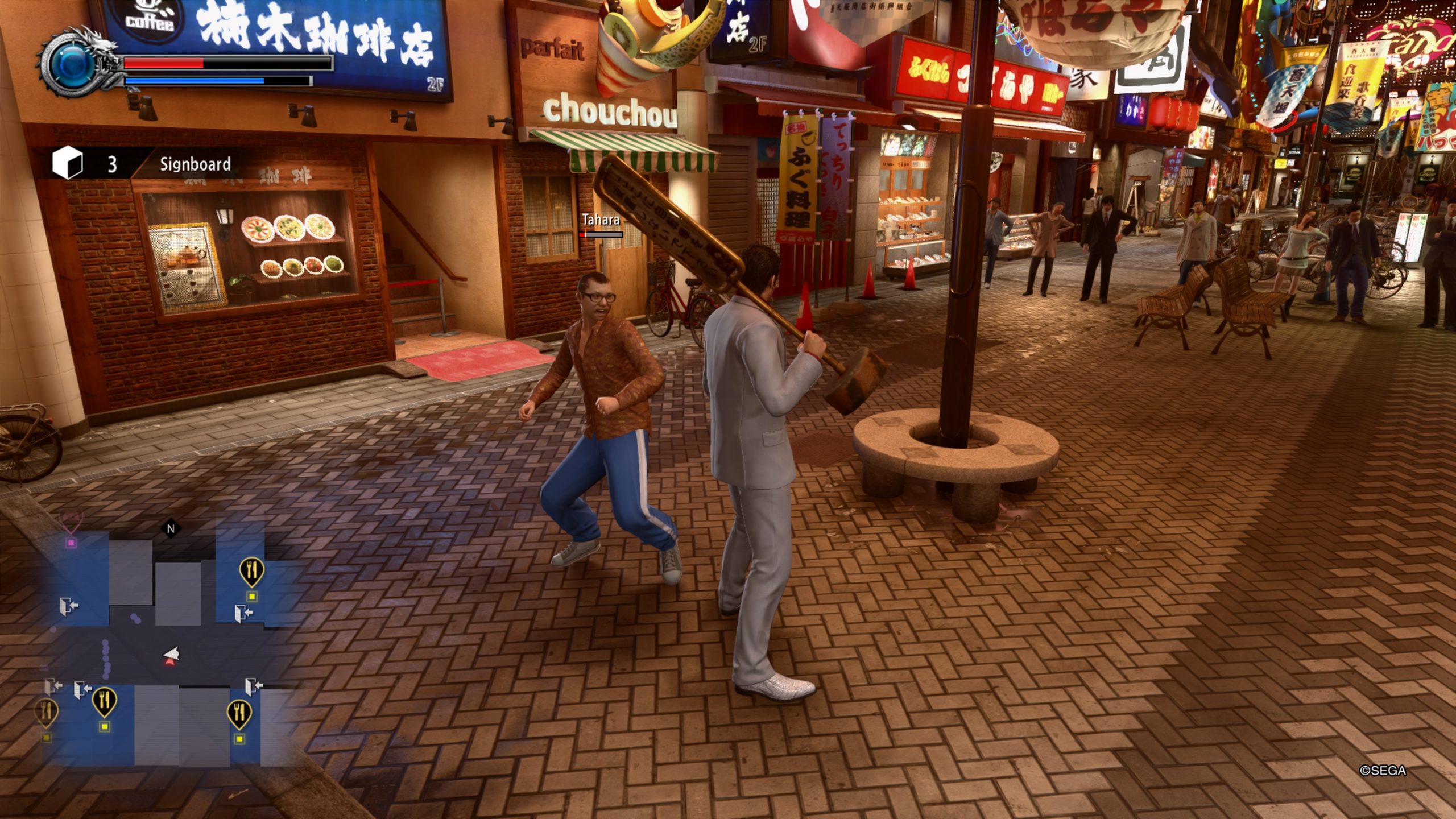 Les phases de combat sont au coeur même du jeu. Le système de combat s’inspire en grande partie de Yakuza 6 et délaisse ainsi, en partie, l’ancien système. Qu’elles soient déclenchées par la trame scénaristique ou par les nombreux voyous qui gangrène les quartiers malfamés de Tokyo et Osaka, les phases de combats vont vous ravir. Tout élément du décor peut être utilisé comme une arme. Vélos, panneaux de signalisations, plots et j’en passe. D’autant que vous pourrez également compter sur plusieurs armes comme des couteaux, des hachoirs, des masses ou des battes de baseball. Chaque coup donné fera augmenter une Heat Jauge qui permettra, grâce à une combinaison de QTE, d’achever votre adversaire dans une séquence de coups très jouissive. Un mode Extrême existe également et permet une plus grande puissance et une plus grande rapidité des coups pendant une courte période.