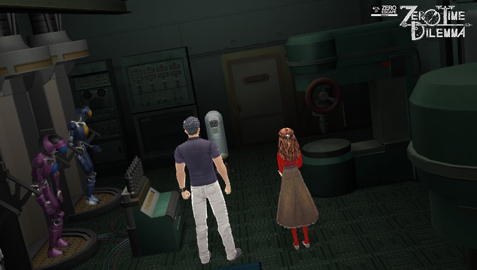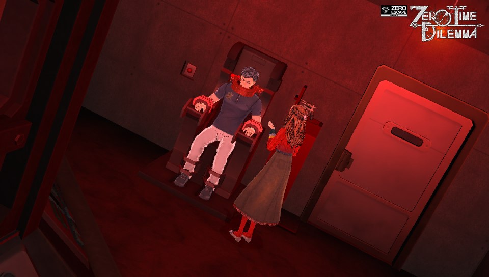 En fait, le mot conclusion est peut-être un peu mal choisi puisque les événements de ce titre se déroulent entre le 1er et 2e volume de la série. Tout comme dans les opus précédents, Zero Time Dilemma nous présente neuf personnages qui se sont fait capturer à leur insu par un mystérieux personnage nommé Zero. L’étranger leur dévoile alors qu’ils sont emprisonnés dans un énorme bunker nucléaire dans lequel ils seront obligés de participer à son jeu de décisions. L’endroit est d’ailleurs séparé en trois sections ce qui divise donc les neuf personnages en trois équipes égales. On retrouve l’équipe C de Carlos, Junpei et Akane. Puis, il y a l’équipe D de Diana, Sigma et Phi. Enfin, la dernière équipe est composée de Q, Sara et Eric. Pour s’enfuir, les participants auront besoin d’obtenir six mots de passe qui ne pourront être obtenus qu’à la mort de six d’entre eux. Saurez-vous faire les choix difficiles pour vous échapper ?