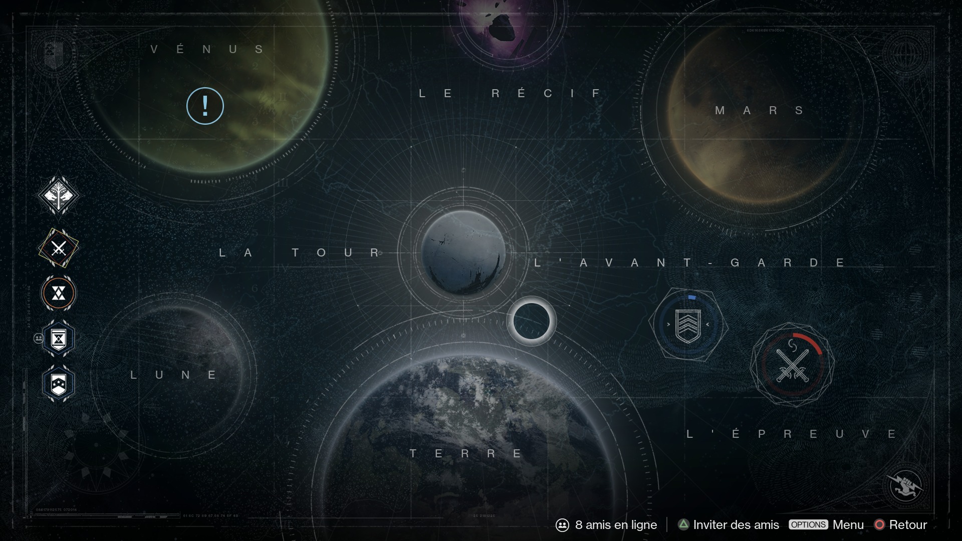 Une fois le didacticiel terminé, il sera temps pour vous de choisir vos missions, et activités. Ces dernières sont réparties sur plusieurs planètes, chacune disposant d’une vaste zone de jeu. Il y a les missions histoires qui sont ici pour faire progresser le scénario du jeu. Les missions patrouilles quant à elles vous permettent d’explorer librement chaque zone du jeu. Les assauts sont des missions coopératives à trois joueurs où vous devrez venir à bout d’un « donjon » comprenant plusieurs boss. Les raids ont également fait leur apparition récemment, il s’agit d’assauts prévus pour une équipe de 6 joueurs de hauts niveaux. Pour terminer, il y a l’Epreuve, le mode compétitif de Destiny. L’Epreuve dispose de plusieurs modes de jeu : Choc (combat en équipe), Domination (capture de zones), Escarmouche (combat en équipe réduite), et Carnage (chacun pour soi). D’autres modes de jeu font des apparitions durant une période limitée.