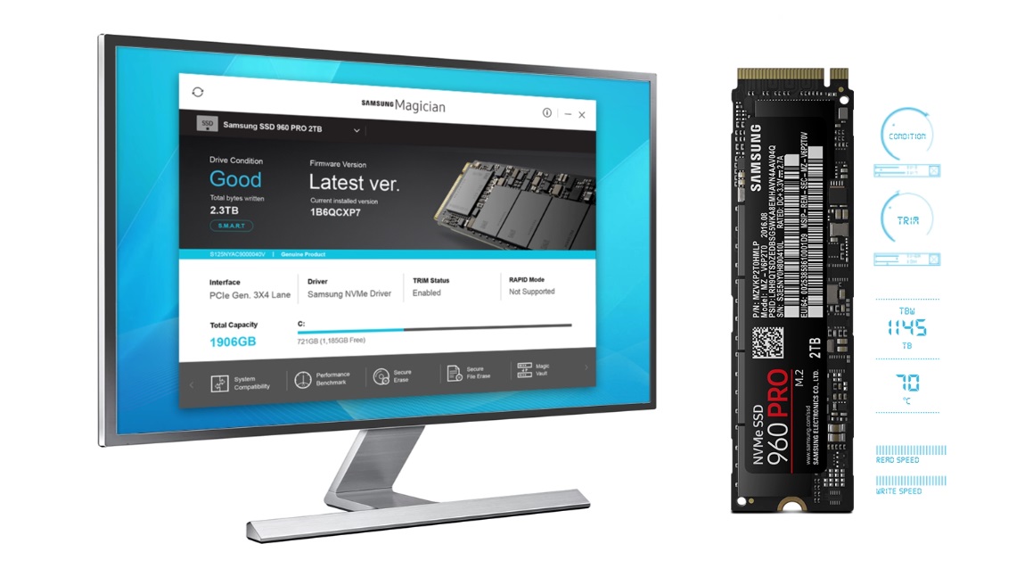 Celui qui a été nommé Magician par Samsung vous permet de faire la gestion, la maintenance et de bien surveiller votre disque SSD. En plus de s’assurer régulièrement que vos firmwares sont bien à jour, on peut aussi s’assurer de faire des nettoyages de disques sécuritaires ainsi que d’effacer des fichiers individuels de manière à préserver nos données confidentielles. Il peut même faire lui-même quelques tests de Benchmark ou enclencher un mode rapide qui permet d’utiliser jusqu’à 1 Gb du DRAM du système comme cache pour les données qu’on accède souvent.
