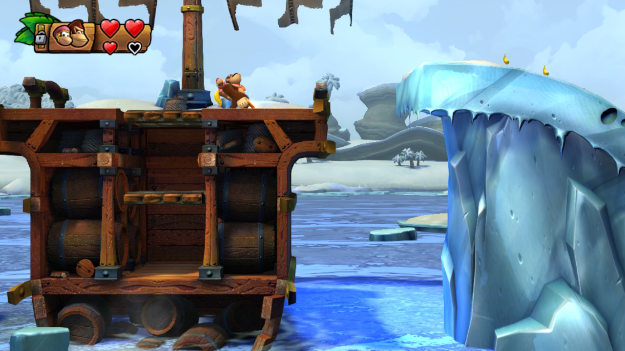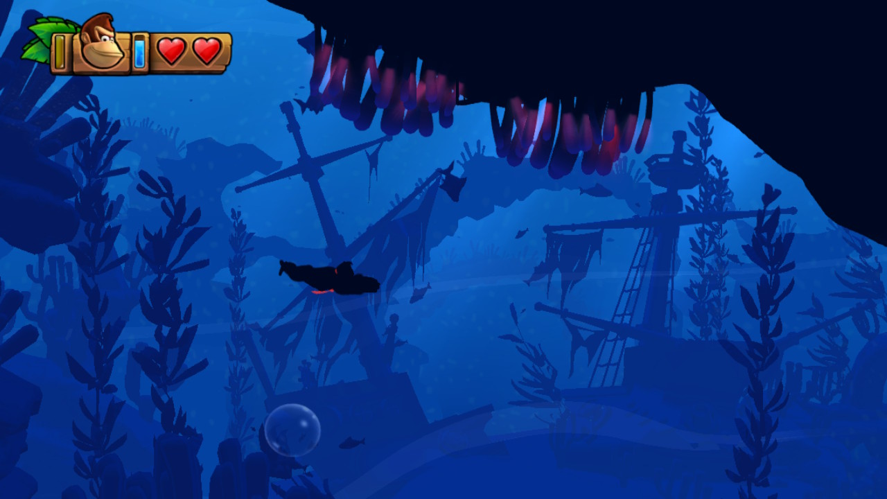 Or, si c’était un bon défi pour moi, difficile d’imaginer les nouveaux venus passer à travers l’aventure. Heureusement, Funky Kong est jouable dans la version Switch pour nous donner un bon coup de main. En plus d’avoir un total de cinq cœurs contre deux pour les autres, il peut aussi faire des doubles sauts. De plus, sa planche lui permet de passer au-dessus des pics et il peut respirer indéfiniment sous l’eau. Il peut même faire la torpille sans arrêt dans l’eau.