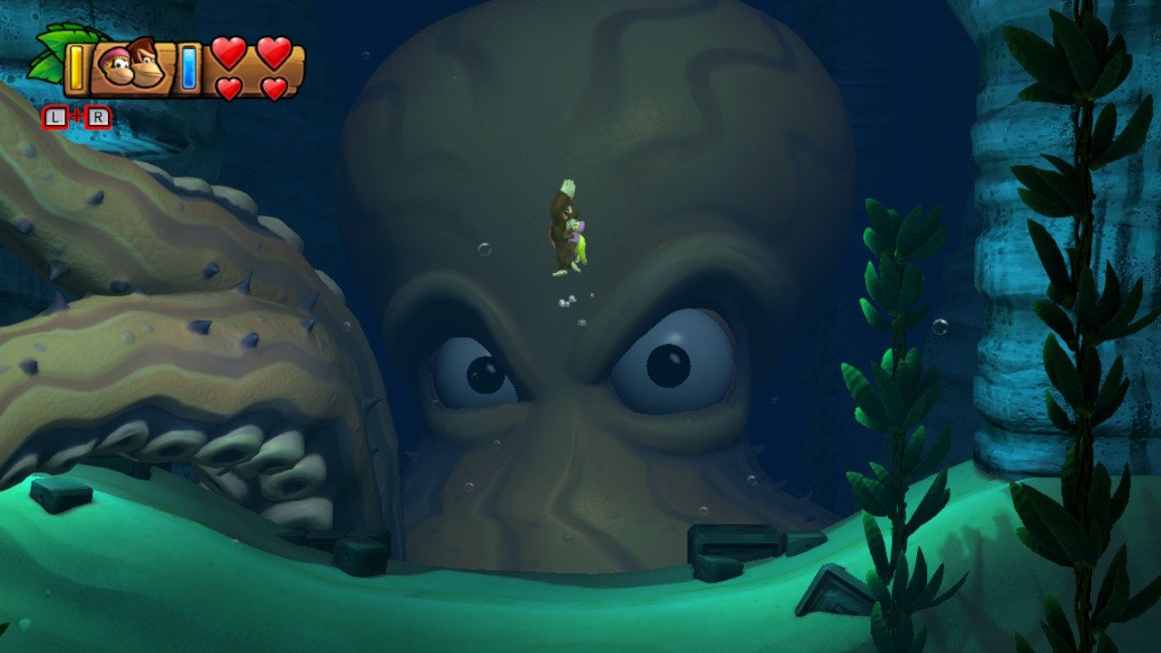 Bien sûr, un jeu de Donkey Kong ne serait pas complet sans un niveau sous l’eau et c’est le cas avec Atoll Tropical. Ce que j’ai surtout aimé dans celui-ci, c’est un des niveaux où une pieuvre nous poursuit. On la voit souvent nous observer de différentes manières dans l’arrière-scène et elle intervient sur le terrain avec ses tentacules. Bref, le fait d’utiliser les éléments du décor même si on est dans un jeu en 2D rend l’expérience beaucoup plus immersive. Le jeu n’a presque rien à envier aux jeux en 3D.