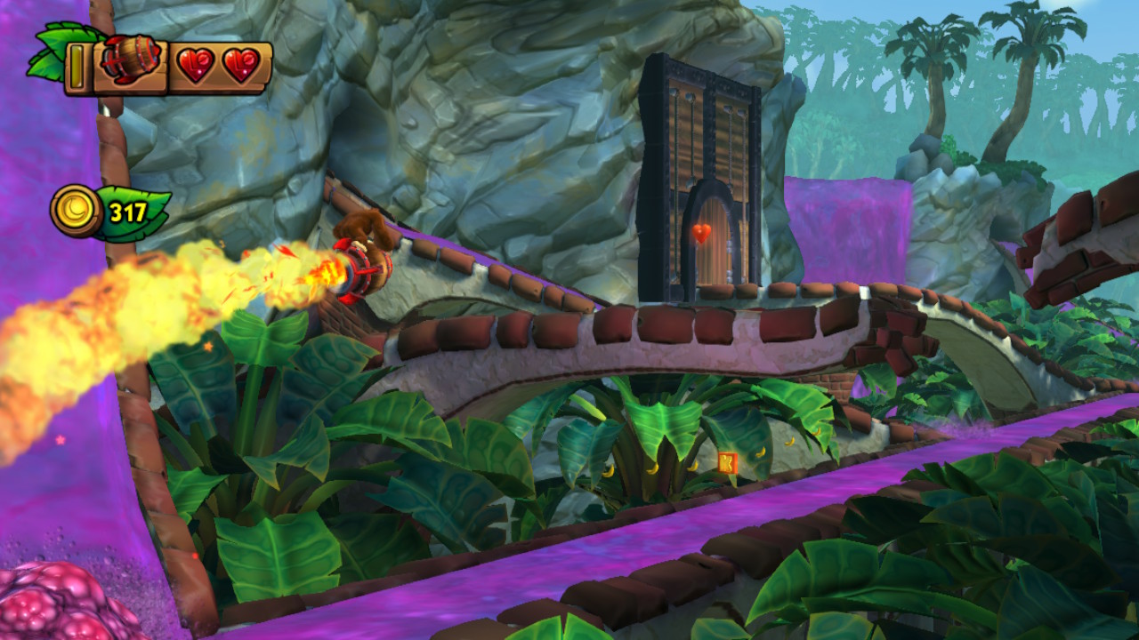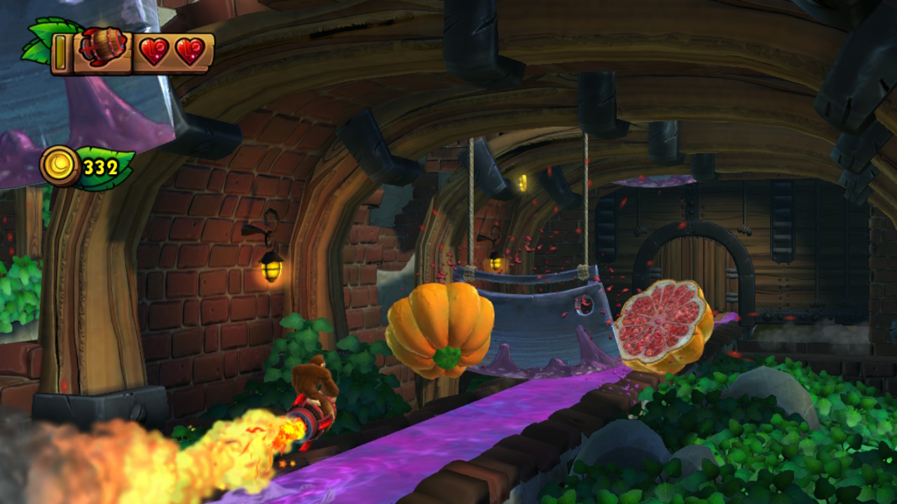 J’ai déjà mentionné quelques fois que Donkey Kong Country: Tropical Freeze offre un vrai bon défi. Une bonne partie de cela repose sur le fait que les designs de niveaux sont particulièrement bien orchestrés. Un saut mal calculé ou un moment d’hésitation une fraction de seconde trop longue et ça pourraient être la fin. C’est particulièrement vrai si vous allez essayer d’obtenir chaque lettre K-O-N-G et chaque morceau de casse-tête. Le fait de voir, par moment, tous les éléments du décor s’effondrer autour de nous ajoute au stress. Souvent, il suffit de recommencer assez souvent pour apprendre chaque obstacle par cœur. C’est ce qui rend le défi tellement amusant.